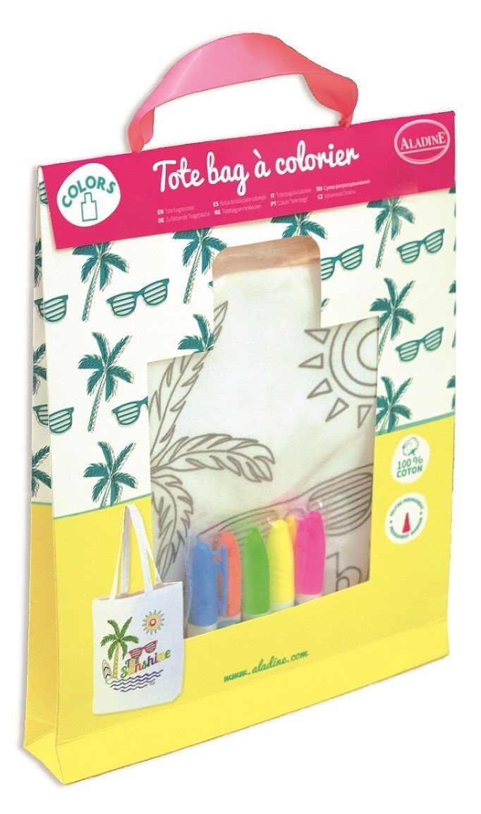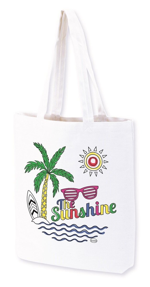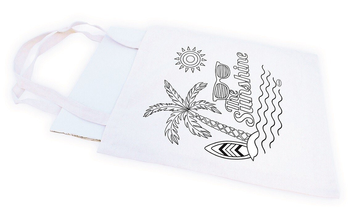 Хлопковая сумка через плечо с принтом и пятью маркерами для ткани в комплекте. После высыхания чернил и термического закрепления (с помощью утюга) ткани можно стирать при температуре 40 градусов Цельсия.