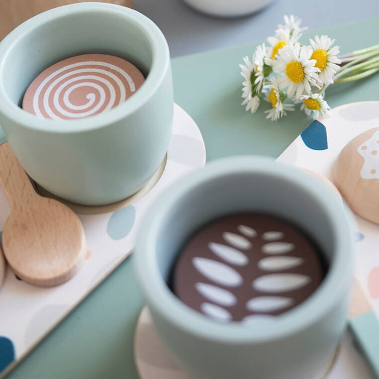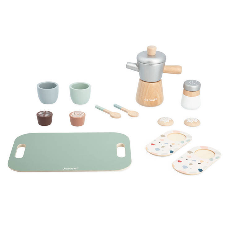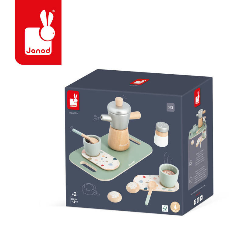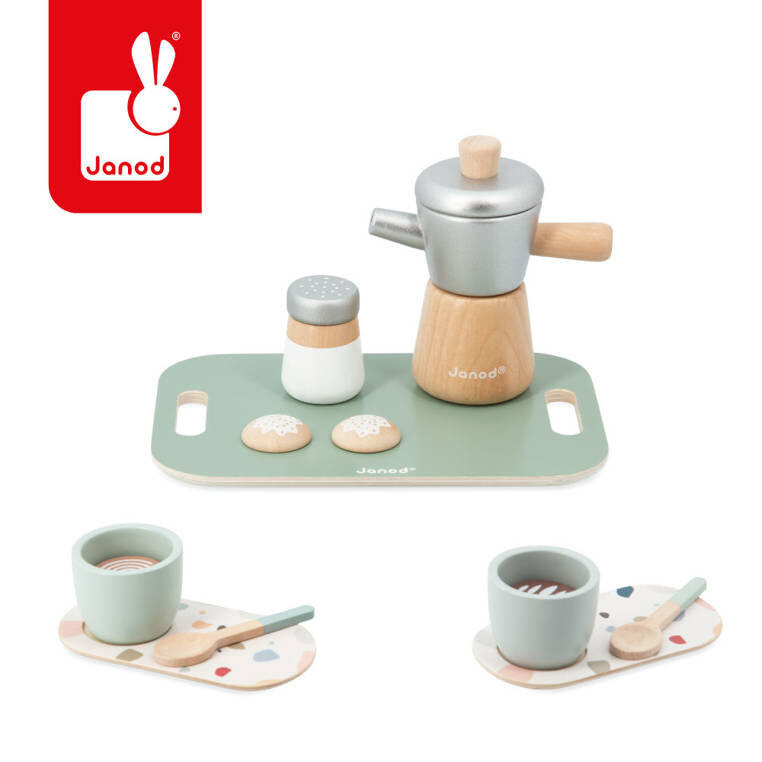 Деревянный набор для приготовления итальянского кофе из серии «Лофт» французского бренда JANOD состоит из 13 элементов и доставит массу радости каждому ребенку.