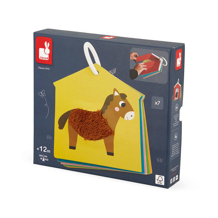 Набор сенсорных карточек для фермы от французского бренда JANOD. Состоит из 7 элементов: 1 карточка с открывающимся элементом (дверь сарая) и 6 карточек с сельскохозяйственными животными (овца, кролик, корова, свинья, курица, лошадь), волосы, мех или кожа которых выполнены из фактурных материалов. Прикосновение к различным фактурам имитирует реальные эмпирические ощущения и развивает у детей осязание. Это также вызывает дополнительный интерес к игрушке.