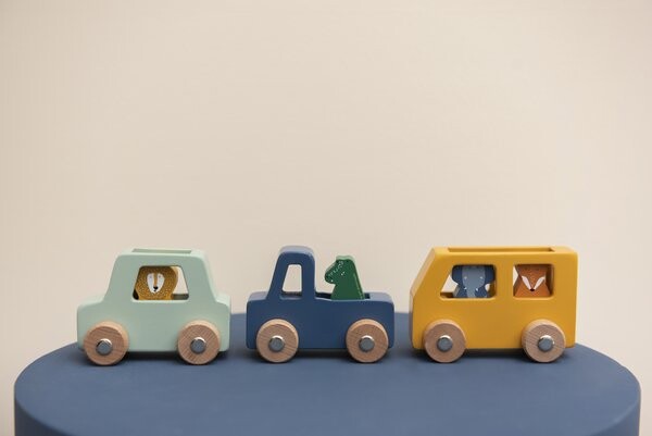 У мистера Крокодайла красивый синий грузовик. Миссис Слон и мистер Лис едут вместе в большом желтом автобусе. У мистера Лайона есть своя маленькая мятная машинка. С ними вы сможете отправиться в множество фантастических путешествий. Три автомобиля и четыре животных предлагают множество интересных способов развлечься.