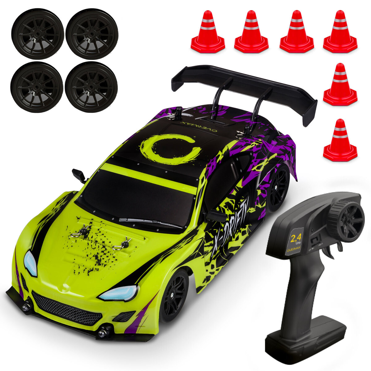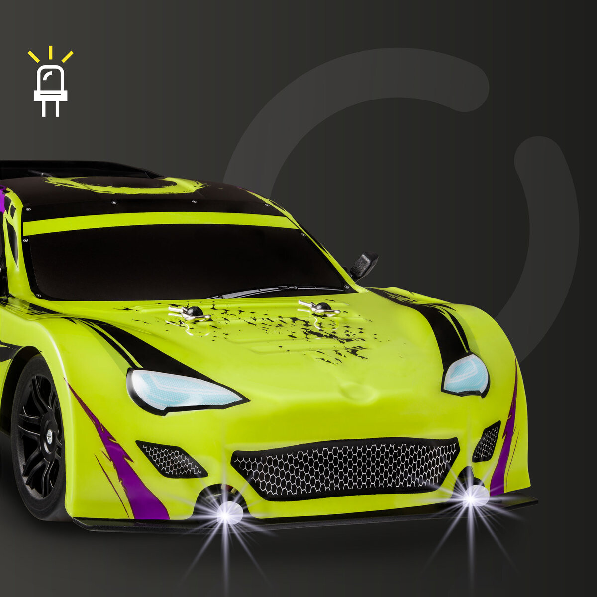 В комплект входит дистанционно управляемый автомобиль, контроллер, инструменты, зарядный кабель, 2 аккумулятора, комплект препятствия, прорезиненные колеса, идеальные для гонок, жесткие колеса, предназначенные для впечатляющего дрифта, и наклейки что позволит вам настроить внешний вид транспортного средства под свои предпочтения.Светодиодные фонари для развлечений в любое время суток