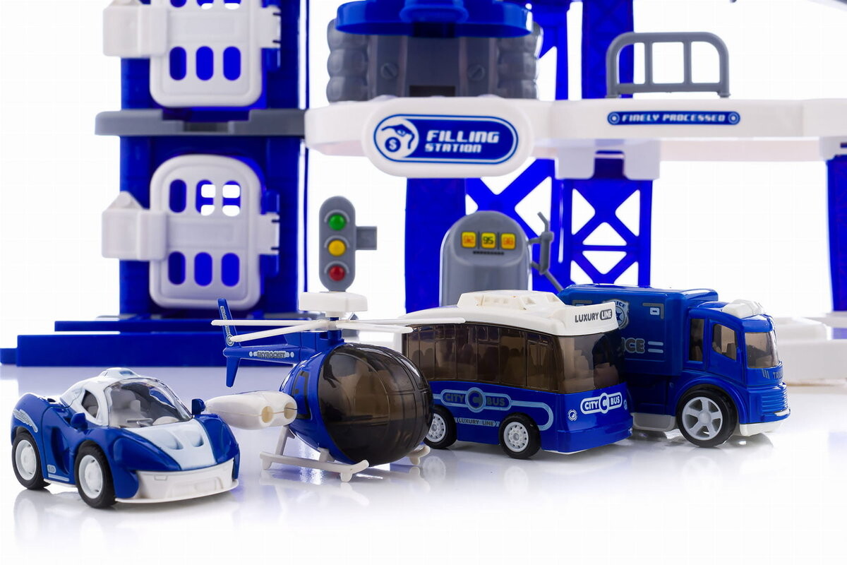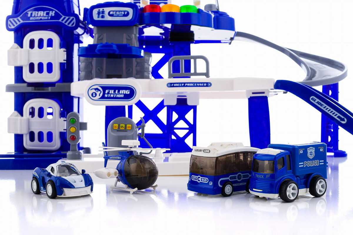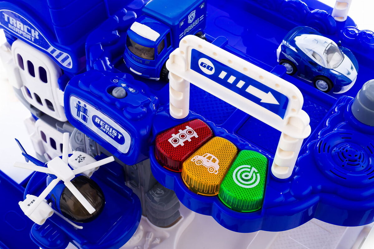 Игрушка изготовлена из качественного пластика, имеет подвижные элементы, играющее и светящееся пианино, размещенное на верхнем этаже парковки, и набор игрушечных машинок.