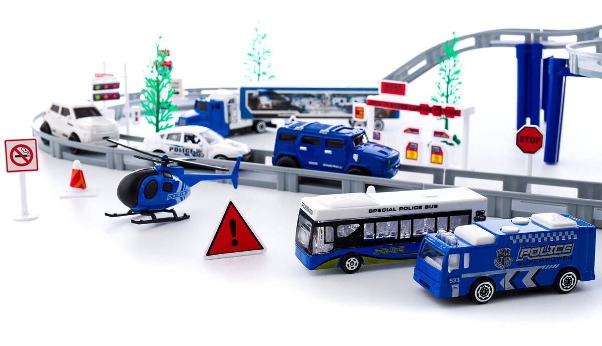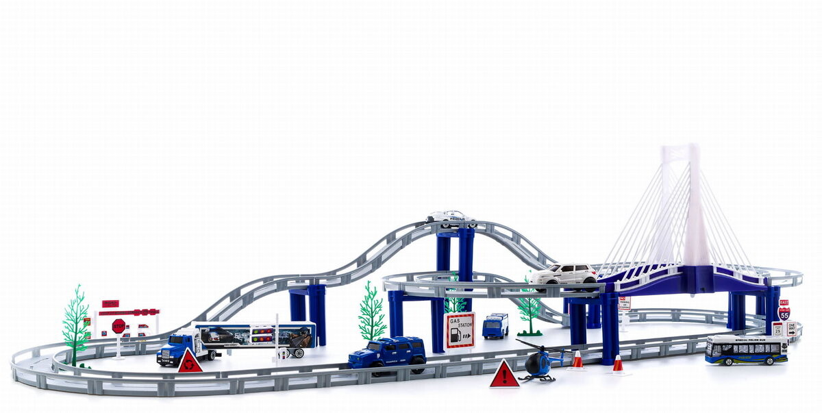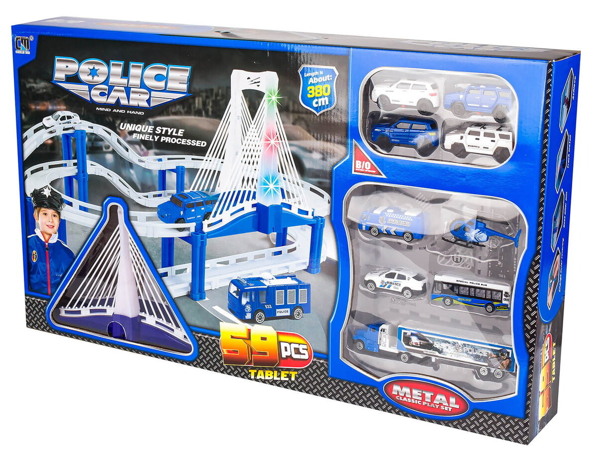 Фантастическая трасса с множеством машин для маленького любителя полицейских погонь. Возьмите на себя роль отважного полицейского и управляйте целой командой машин.
