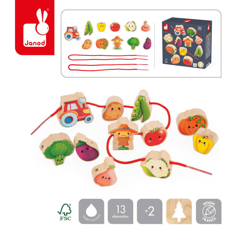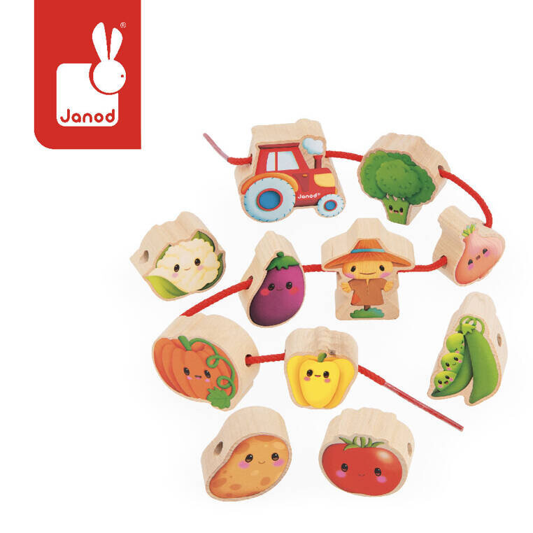 В комплект входят две красные нитки с ламинированными концами, на которые можно нанизывать деревянные элементы: 9 овощей (в том числе горох, баклажаны или тыква), трактор и чучело. при этом создавая различные истории из жизни на ферме. Игрушка была разработана во Франции.