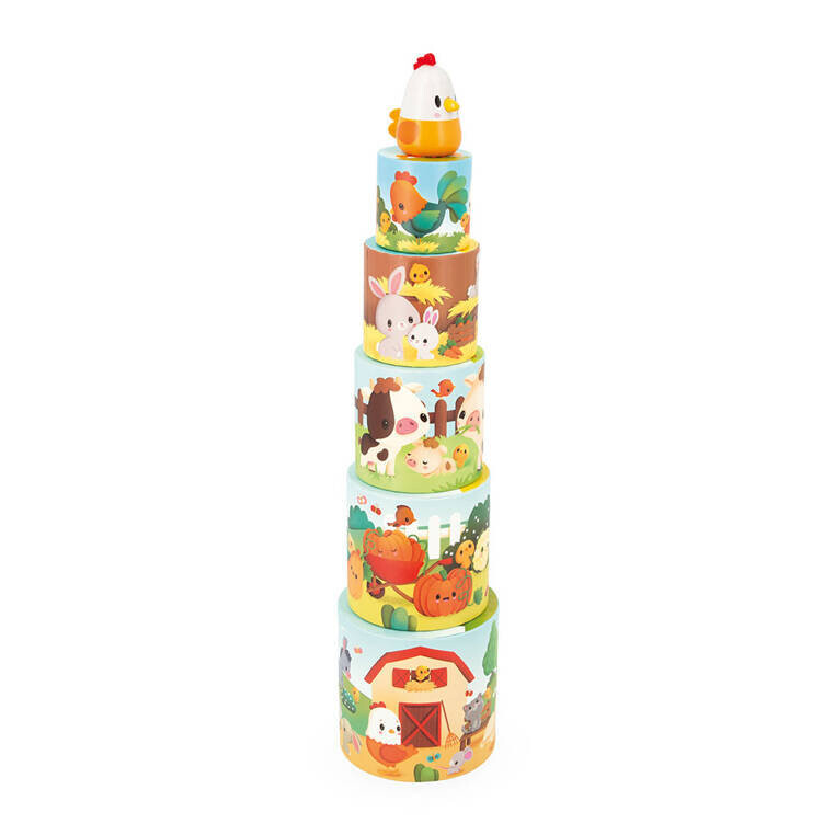 Пиармида Курка из коллекции Farma французского бренда JANOD состоит из 5 блоков-цилиндров, выполненных из плотного картона и деревянной лисички. Блоки бывают разных размеров поэтому их можно складывать друг на друга или прятать друг в друге. Они удобны и интересно иллюстрированы сценами из деревенской жизни.