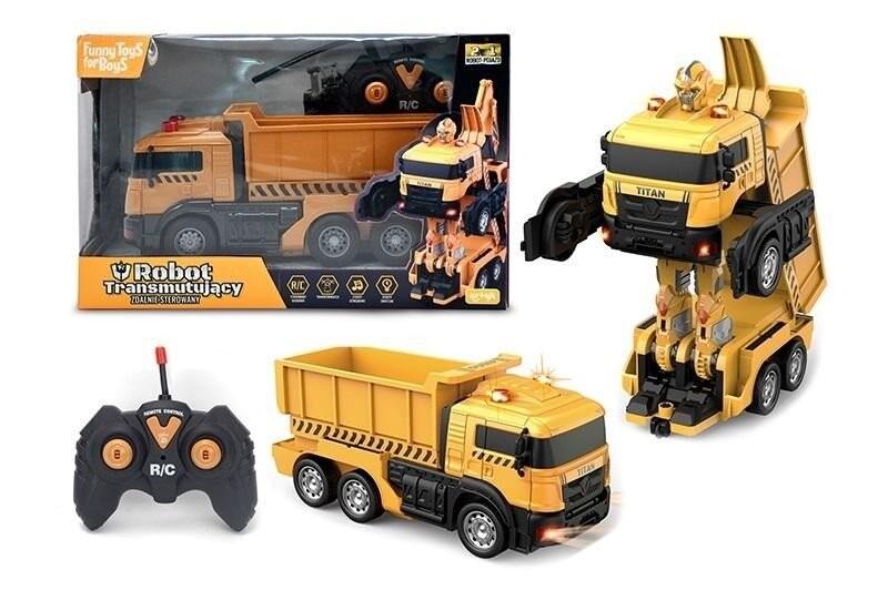 В комплект входят: самосвал, пульт дистанционного управления, отвертка, кабель для зарядки автомобиля, функции: полный запас хода, подсветка во время движения, передвижной саморазгрузочный ящик, трансформация в робота с помощью кнопки на пульте,