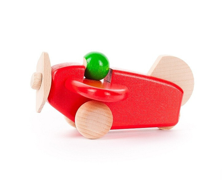 Самолет, который движется по взлетно-посадочной полосе, готовится к полету. Кто это контролирует? Его направляет пилот. Видна только его голова в шлеме контрастного с самолетом цвета. Когда пилот ускоряет самолет, вы можете видеть, как пропеллер вращается все быстрее и быстрее. Игрушка тогда выглядит так, как будто вот-вот улетит. Самолет был спроектирован с учетом потребностей маленьких детей. Его форма, размер отверстий и подвижных элементов позволяют обнаружить хват пальцев и распознавать формы. Каждое движение игрушки – толкание, перекатывание, катание по изгибам мебели – это также открытие пространства и динамизма, скрытого в теле. Игра с самолетом развивает крупную моторику.