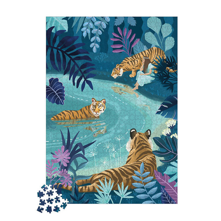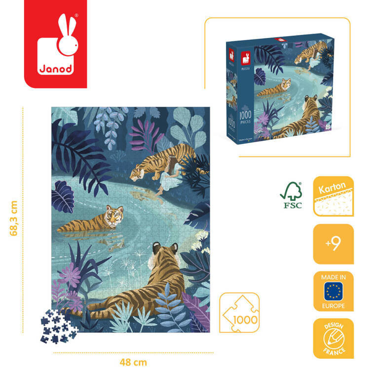 Художественный пазл «Встреча тигров» французского бренда JANOD состоит из 1000 элементов, которые, собранные вместе, создают красивую живописную графику: изгиб реки в тропическом лесу во многих приглушенных оттенках синего. , над которым встретились три тигра и села длинноволосая девушка в ярком платье и с венком на голове. Готовая иллюстрация имеет размеры 68,3 х 48 см и в рамке может стать восхитительным украшением детской комнаты или другого места в доме. Тем более, что его тематика, цвета и дизайн идеально соответствуют последним тенденциям дизайна интерьера.