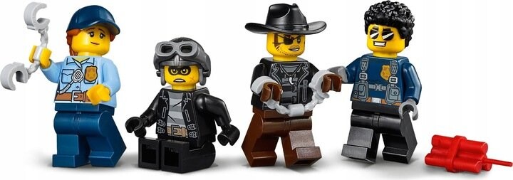 - В коробке находятся аксессуары LEGO: наручники, мотоциклетный шлем, обычный шлем и две динамитные шашки.
