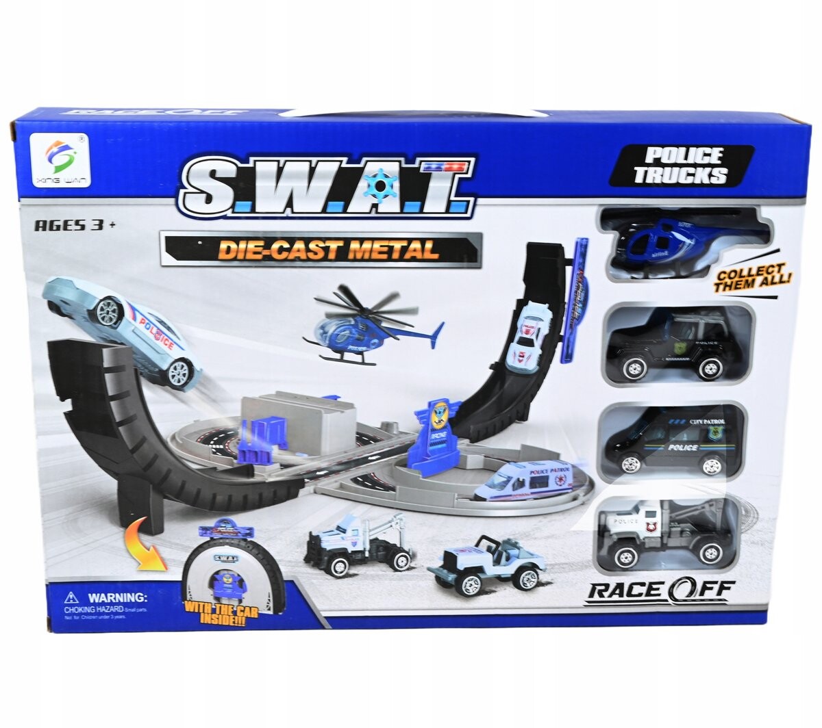 В набор входят четыре полицейские машины, изготовленные из металла и пластика. Размеры упаковки: 36 х 6 х 27 см.