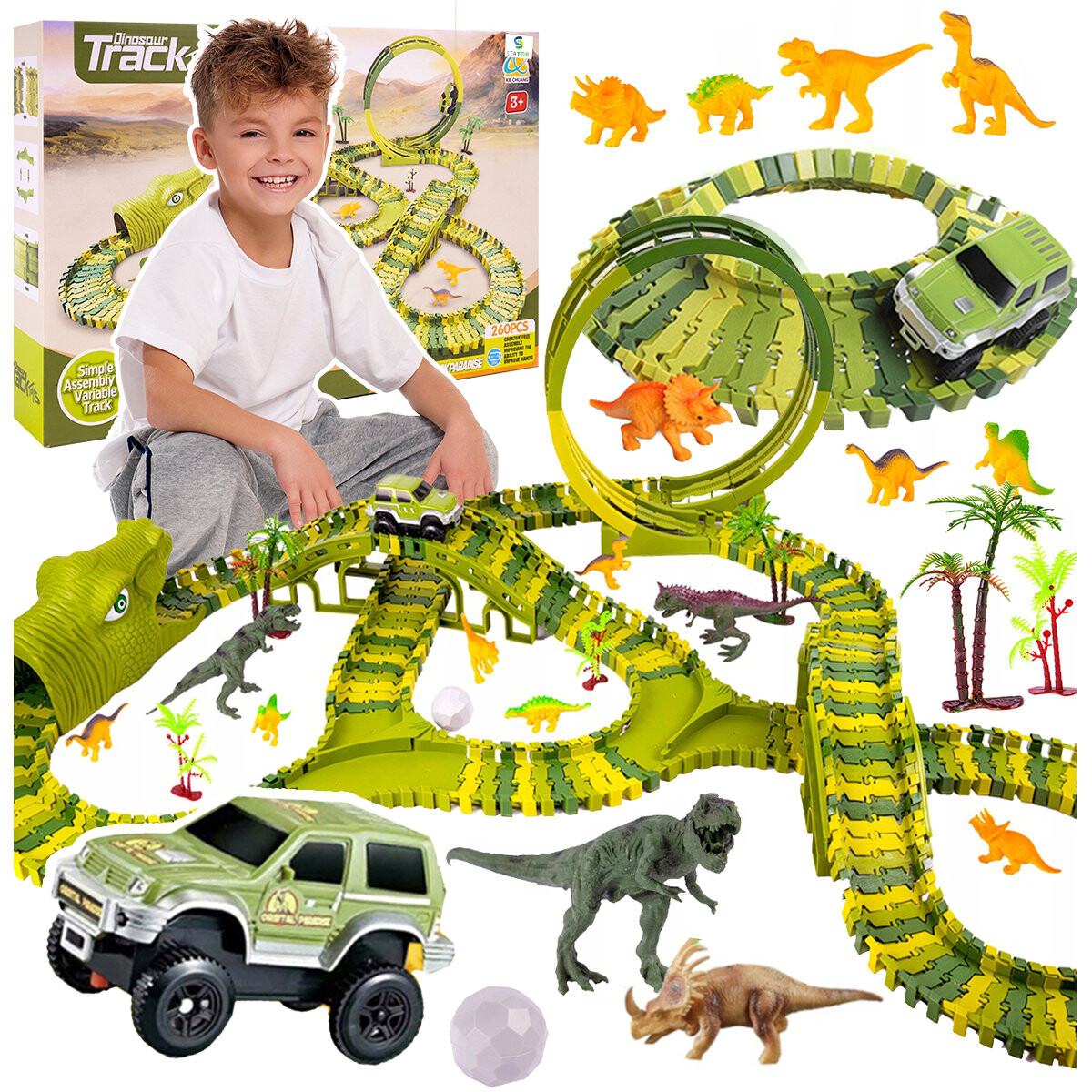 ➡ ДЛИНА ГУСЕНИЦЫ 452 СМ |➡ ПАРК ДИНОЗАВРОВ ➡ ЛЮБАЯ КОНФИГУРАЦИЯ | ➡ АВТОМОБИЛЬ НА АККУМУЛЯТОРЕ |➡ 2 X БОЛЬШИХ ДИНОЗАВРОВ |➡ 6 X МАЛЕНЬКИХ ДИНОЗАВРОВ самые важные особенности и преимущества:Мега набор! Общая длина трассы по прямой – 452 см!