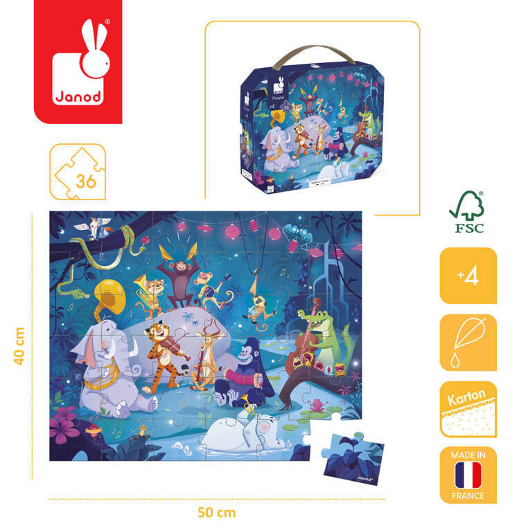 Набор-пазл «Летний фестиваль» в чемодане от французского бренда JANOD состоит из 36 элементов, которые, сложившись вместе, создают красивую, детализированную картину, изображающую оркестр животных в празднично украшенной лесной роще у реки. , м. в . слон, играющий на тубе, тигр, играющий на скрипке, бегемот, играющий на трубе, горилла, играющая на губной гармошке, обезьяна, играющая на барабане, змея с погремушкой и лягушка, дирижирующая ими. Готовая иллюстрация имеет размеры 50 х 40 см.