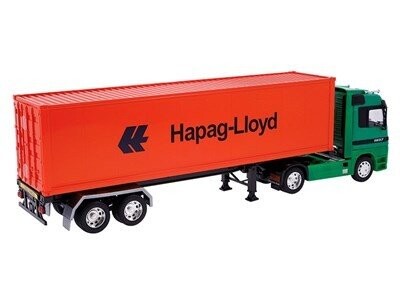 Модель тягача MERCEDES-BENZ Actros 1857 в масштабе 1:32, металлическая с пластиковыми элементами и резиновыми шинами.Полуприцеп: прочный пластик, хорошее качество. Он имеет открывающиеся задние двери, колеса с резиновыми шинами и выдвижные парковочные ножки. Полуприцеп можно отсоединить от тягача. Модель тягача окрашена оригинальной автомобильной краской.комплект в красивой упаковке - идеален для подарка