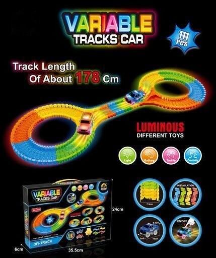 Светящаяся автомобильная трасса – отличный подарок для самых маленьких любителей автогонок. Изделие легко собрать и доставит массу удовольствия на долгие часы. В комплект входит трек со 110 элементами и 1 машинка со светодиодными фонарями длиной 9 см.