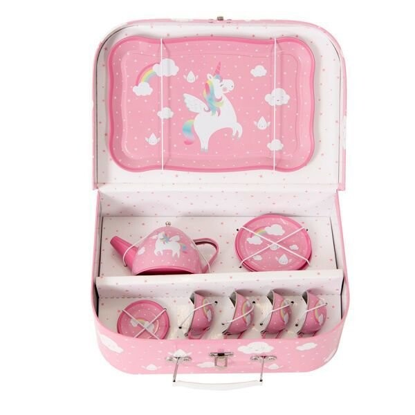 В красивом розовом чемодане с единорогами находится металлический чайный сервиз на 4 персоны. Посуда также розового цвета с мотивами радуги и единорога.