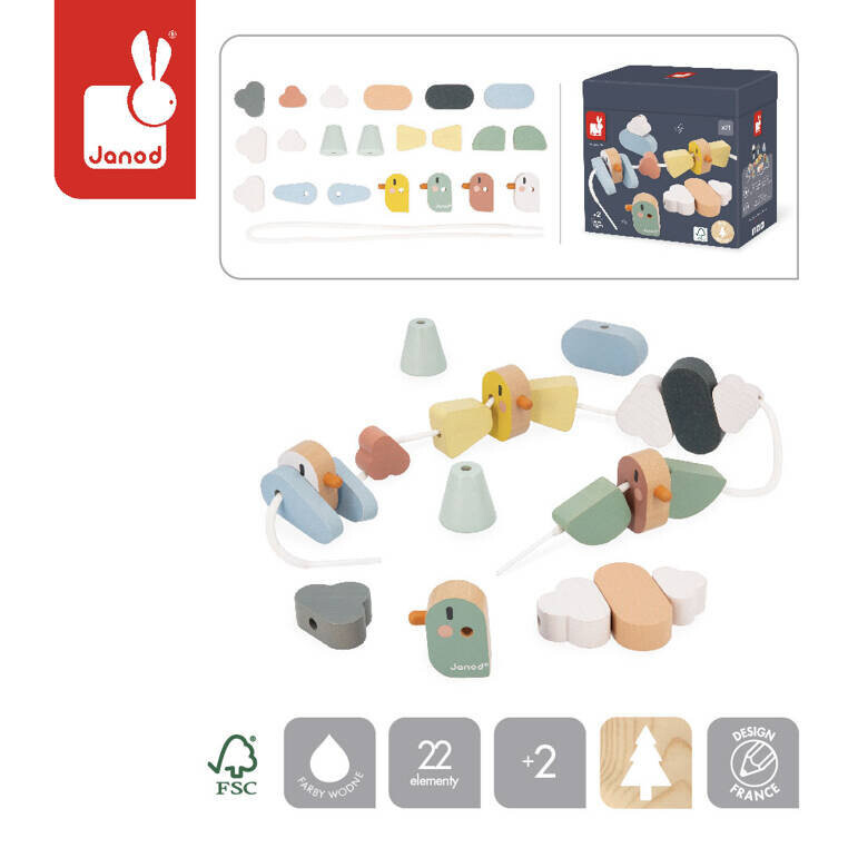 В комплект входит длинная белая веревка с ламинированными концами, на которую можно нанизывать деревянные элементы различной формы. Всего их 21, из них 4 — туловища птиц, а остальные могут образовывать, например, туловища птиц. крылья, розетки деревья или облака.