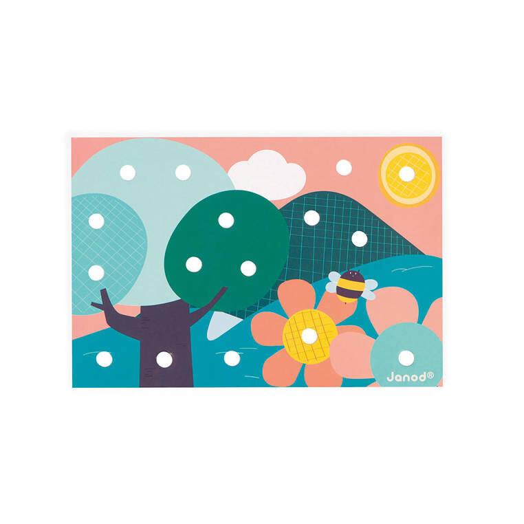 Моя первая мозаика от французского бренда JANOD — креативная игрушка для малыша, который учится различать и сопоставлять цвета, а также тренирует хватку и так называемую мелкая моторика. Набор состоит из 6 досок из плотного картона с вырезанными отверстиями, в которых следует разместить круглые деревянные элементы, по цвету совпадающие с фоном в заданном месте иллюстрации.