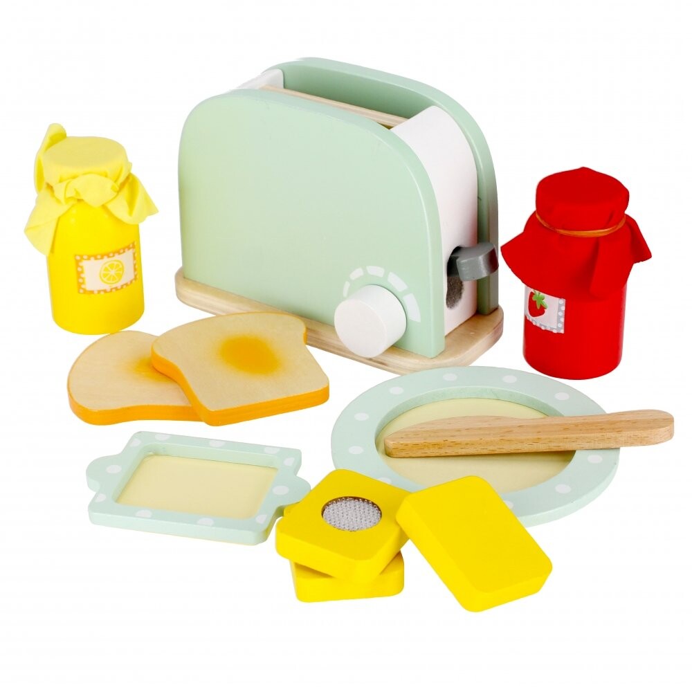 В наборе: тостер, нож, тарелка, поднос, 2 тоста, 2 бутылки с джемом, 3 ломтика желтого сыра, кусочки сыра на липучке.