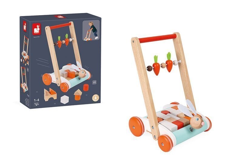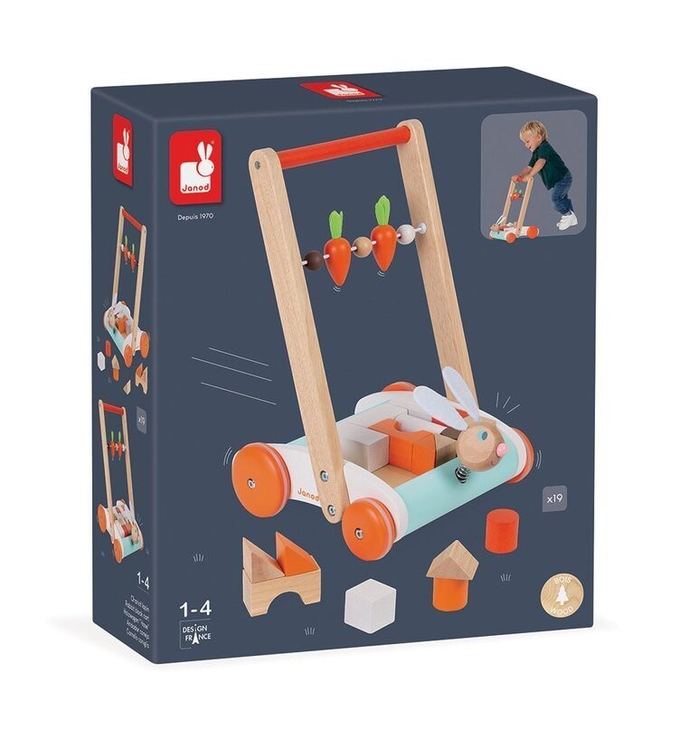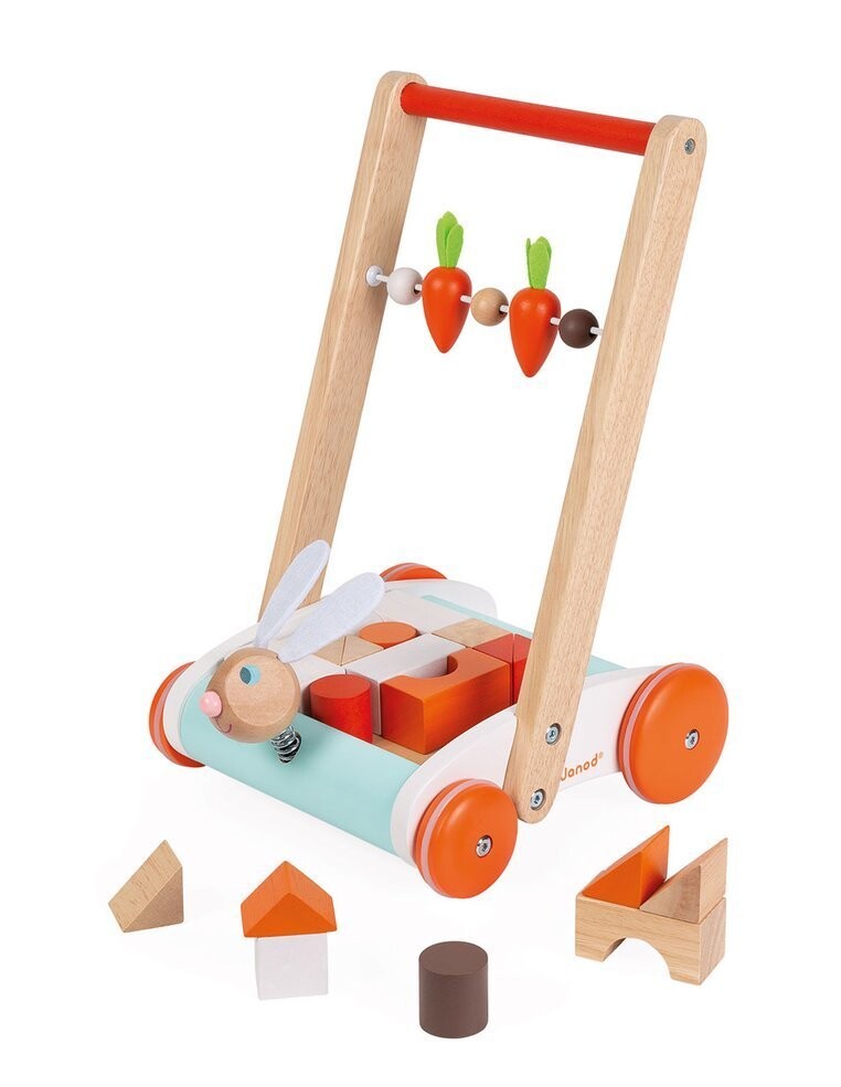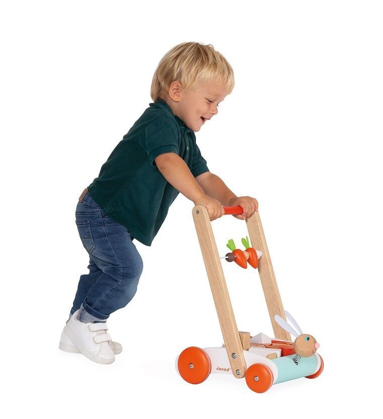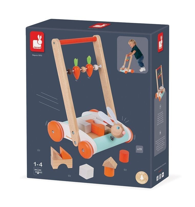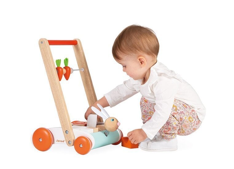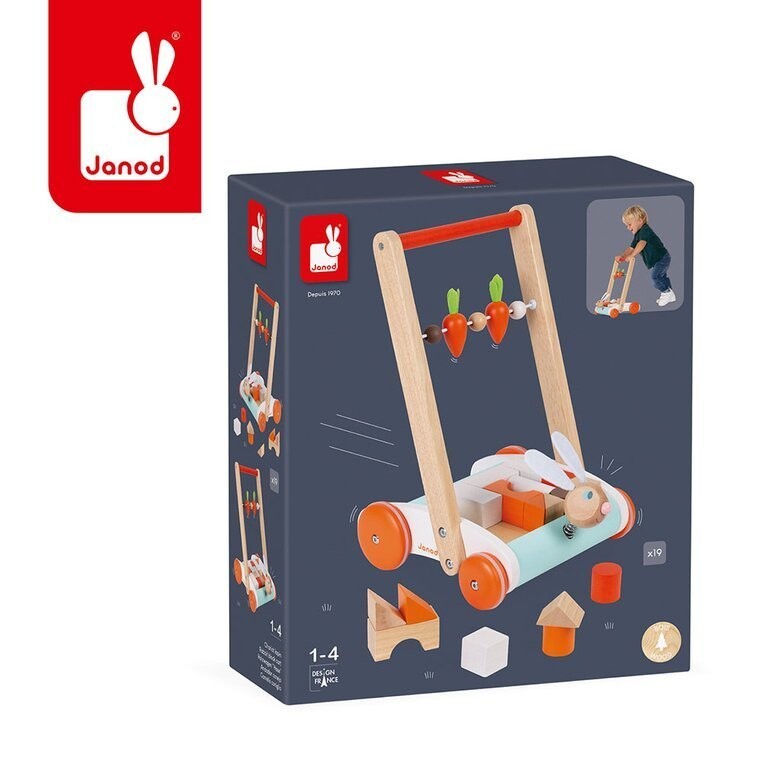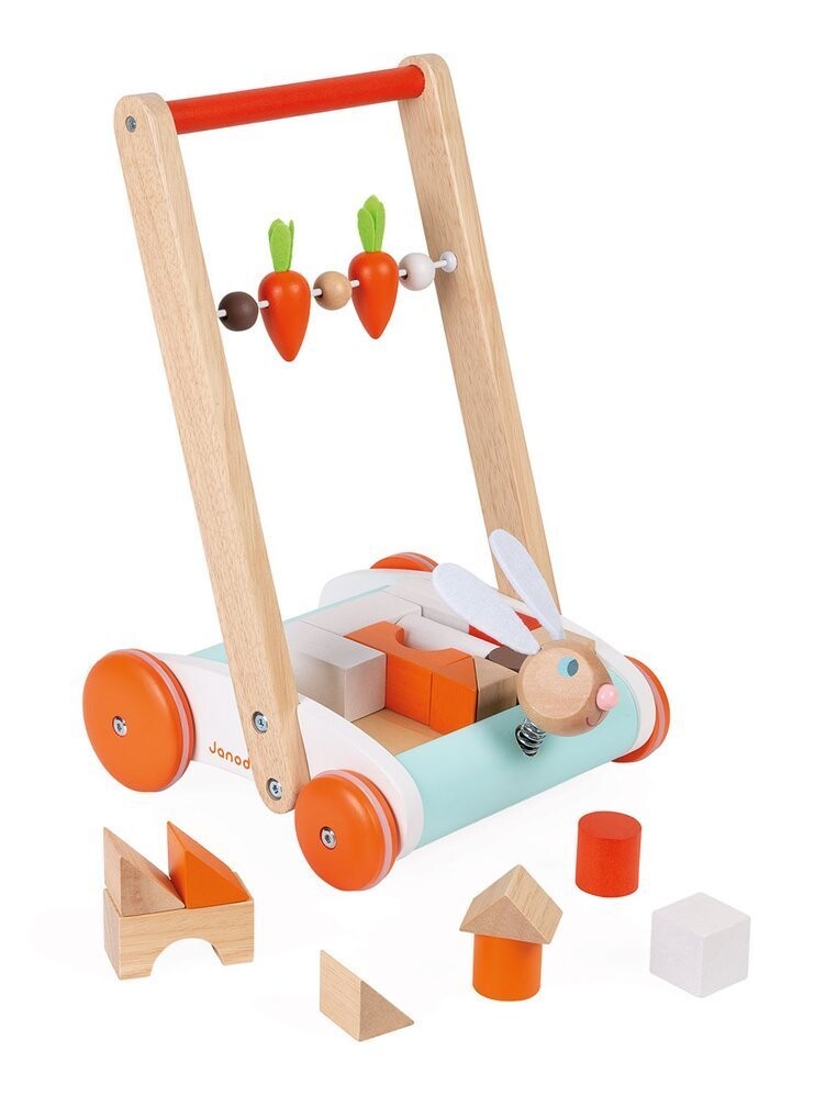 Деревянная коляска с 19 кубиками из серии Rabbit от французского бренда JANOD — отличный спутник для первых шагов ребенка.