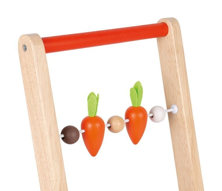 На ручке расположена планка с деревянными элементами для перемещения (3 бусины и 2 морковки с фетровым верхом), а спереди на пружинке голова кролика с длинными фетровыми ушками смешно раскачивается во время вождения.