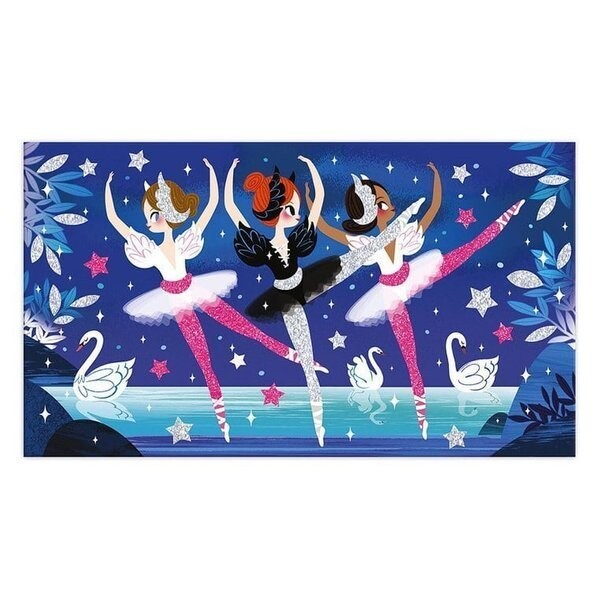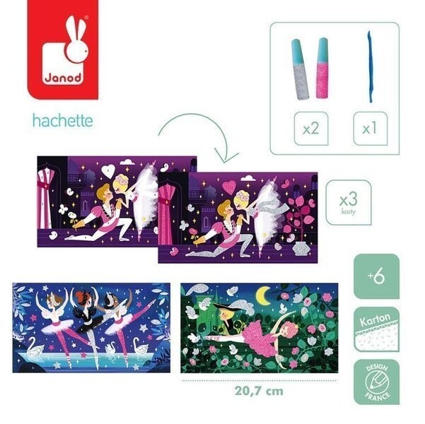 Креативный набор Magical Glitter Swan Lake от французского бренда JANOD содержит 3 доски - изображения балерин во время выступлений на сцене. Картины имеют самоклеющееся покрытие, поэтому после снятия защитного слоя - в отведенных местах - иллюстрации можно посыпать входящим в набор блестками двух неоновых цветов: серебристого и розового. Блеск прилипает к изображениям, оставляя на них тонкую блестящую структуру. В набор также входит лопаточка, которая поможет снять декорируемые поверхности. Приклеивание блестящих частиц подарит вашему ребенку долгие часы увлекательного и в то же время успокаивающего веселья. А готовые картинки станут отличным декоративным элементом детской комнаты.