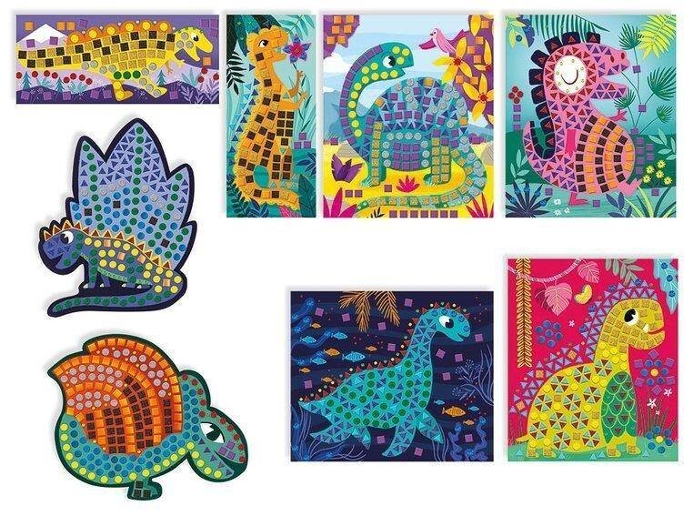 Креативный набор «Мозаика Динозавры» от французского бренда JANOD состоит из 8 картонных картинок (6 прямоугольных и 2 неправильной формы), на которых изображены доисторические существа в экзотической обстановке. К этим иллюстрациям вы можете прикрепить входящие в набор пенопластовые наклейки маленького и чуть большего размера различной геометрической формы — круглой, квадратной и треугольной (более 2200 штук!) и 12 разных цветов (каждый цвет на отдельной странице) — как в предложенных местах и в любом желаемом месте листа), в том числе 5 с глянцевым эффектом. Кроме того, в наборе более 140 мелких и более 60 крупных самоклеящихся «бриллиантов» в 4-х цветах. Наклеивание наклеек – это долгие часы увлекательного и в то же время успокаивающего веселья для ребенка. А готовые картинки станут прекрасным декоративным элементом детской комнаты.