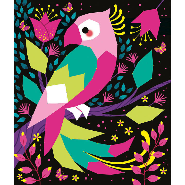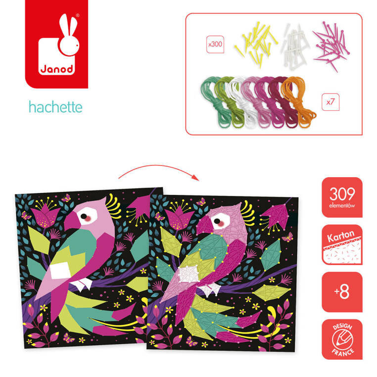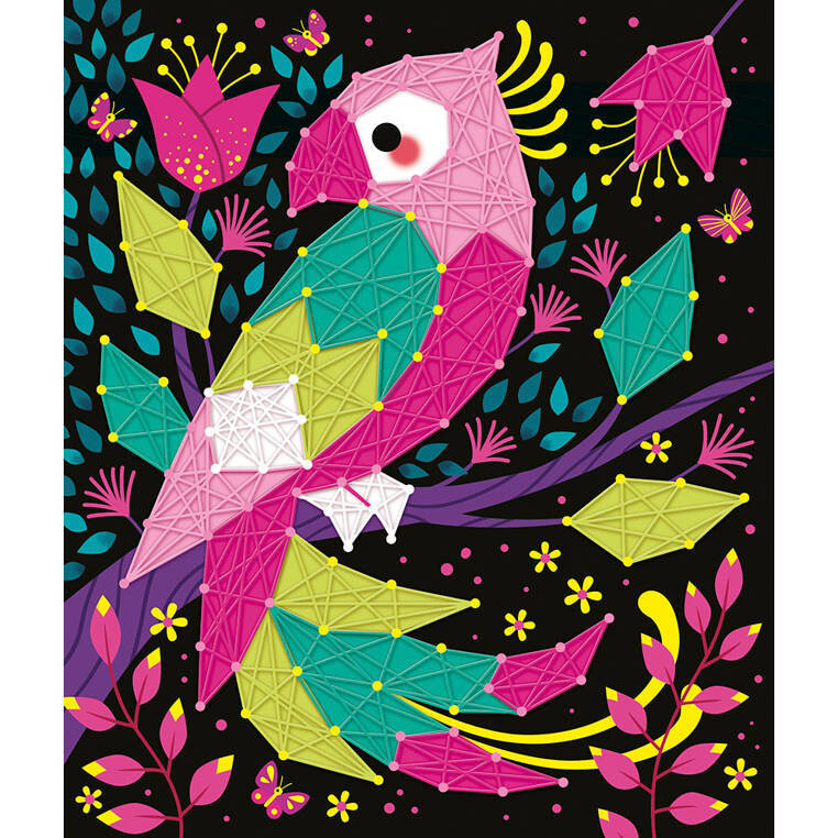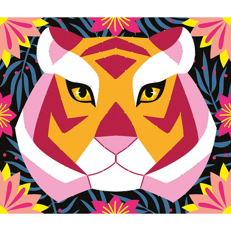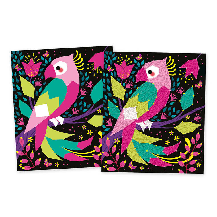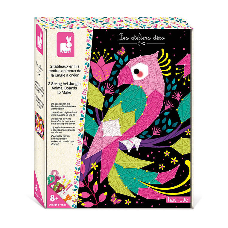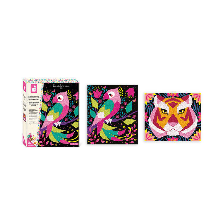 В набор «Креатив 3D String Art Jungle Animals» от французского бренда JANOD входят 2 доски из плотного пенопласта с изображением диких животных: попугай и тигр с неоновыми элементами и неоновой окантовкой, 300 безопасных пластиковых гвоздей трех цветов, которые следует вставить и вдавить в отмеченные на досках точки, 7 разноцветных мотков ниток, чтобы оплести их вокруг. , в соответствии с прилагаемой подробной инструкцией.