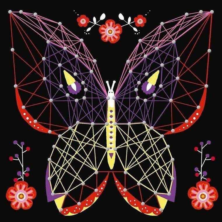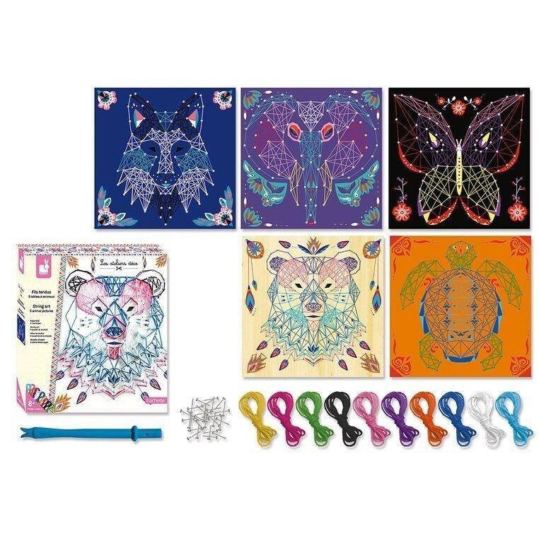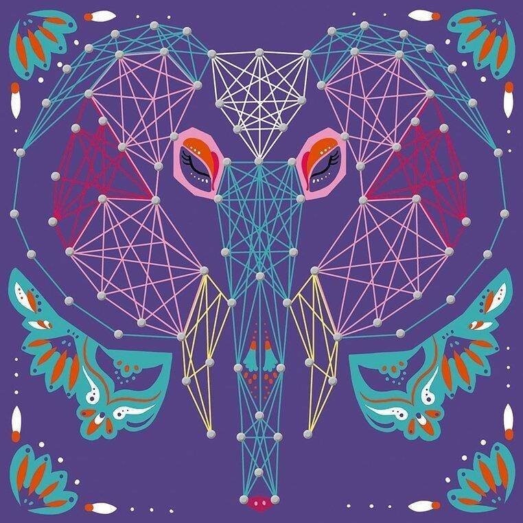 Творческий набор String Art Animals от французского бренда JANOD содержит 5 досок из плотного пенопласта с анималистической графикой: большой рисунок медведя и 4 изображения поменьше: волка, слона, черепахи и бабочка, 800 гвоздей, которые нужно втыкать/вдавливать в отмеченные на досках точки, 10 разноцветных мотков ниток и инструмент для облегчения вбивания гвоздей и вплетая в них нить, согласно прилагаемой подробной инструкции. Стринг-арт — очень интересная техника продевания разноцветных нитей между точками, создавая абстрактные геометрические узоры. Это пространственная работа, и ее эффекты ошеломляют. Таким образом будут созданы уникальные картины из струн. Летать или просто забивать маленькие гвозди для ребенка это долгие часы увлекательного и в то же время успокаивающего веселья, а готовые работы станут предметом гордости и прекрасным декоративным элементом детской комнаты. Набор был разработан во Франции в сотрудничестве с французской медиа-издательской группой Hachette. Упакован в стильную картонную коробку. Идеально подходит для подарка.