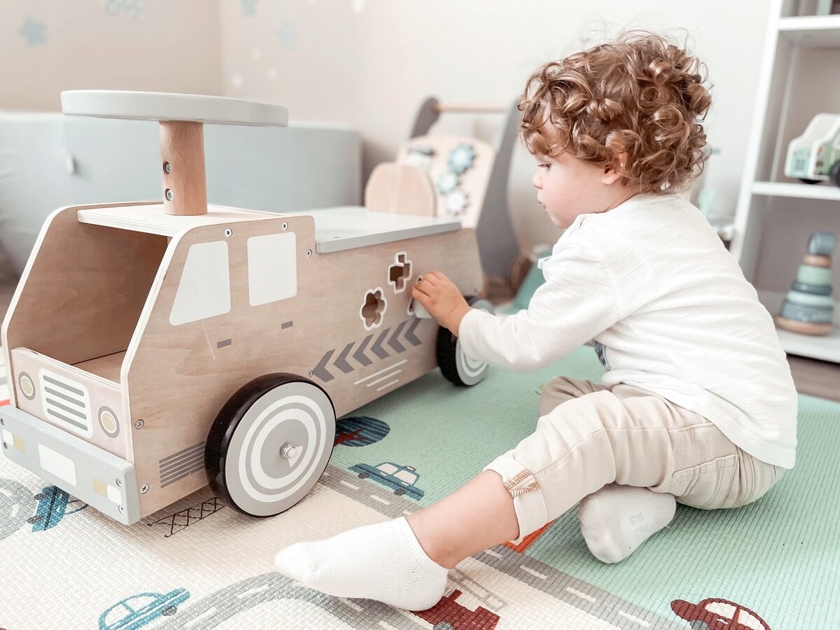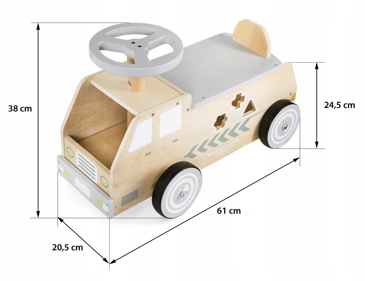 У автомобиля красивый скандинавский дизайн . Он окрашен в приглушенные цвета, подчеркивающие натуральный цвет материалов. Колеса игрушки защищены специальной резиной, которая не скользит и не царапает поверхность. Основные характеристики:
