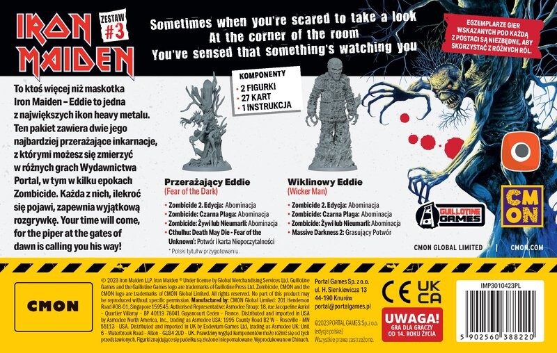 Набор персонажей Iron Maiden №3 содержит две большие фигурки легендарного талисмана Iron Maiden — Эдди. Вместе с ними поставляются компоненты, необходимые для их использования в качестве компонентов в различных играх от CMON и Portal Games.