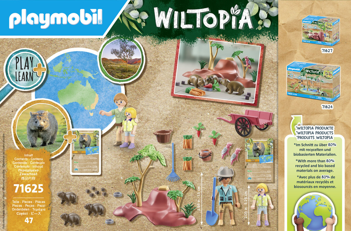 Игровой набор PLAYMOBIL, созданный с учетом принципов устойчивого развития, включает в себя две фигурки PLAYMOBIL, вомбатов, какаду и множество других замечательных растений и аксессуаров. Фигурки: 1 мужчина в шляпе, 1 девочка Животные: 3 вомбата, 2 какаду Аксессуары: 1 земляной холмик с. укрытие, 2 дерева, 2 кусочка травы, 2 миски для еды, 2 морковь, 5 помета вомбата, 1 деревянная тележка, 1 плетеная корзина с зеленым кормом, 1 лопата, 1 грабли, 1 деревянное ведро.