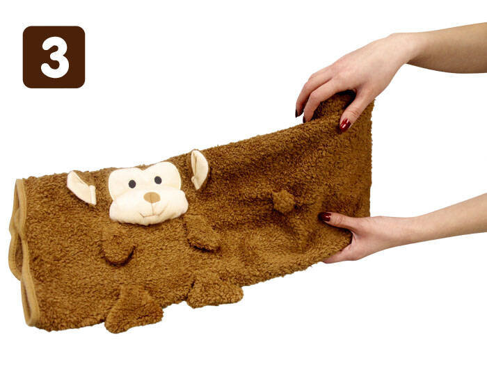Малыши любят животных, поэтому благодаря этим чудесным одеялам вы сможете подарить им такое удовольствие. За 3 простых шага одеяло можно превратить в талисман. Одеяло сворачивается и создается талисман, свернутый конец закрепляется петлей, и животное готово к обниманию.
