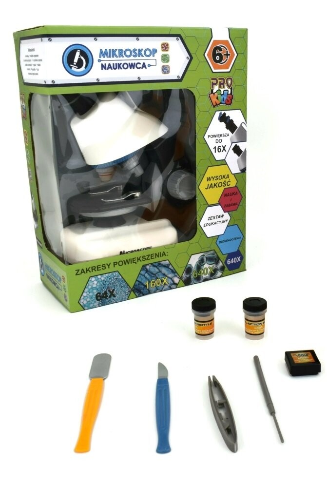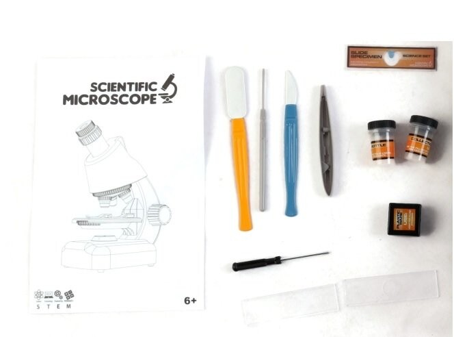 Микроскоп для обучения и развлечения. Набор состоит из настоящего микроскопа и необходимых аксессуаров для исследований и наблюдений. Микроскоп увеличивает изображение в 100, 400 и 1200 раз. Игрушка развивает у ребенка технологические и инженерные способности, а также строгий математический ум, увлекая наукой и изучая микро- и макровселенную. В комплект входят: Микроскоп с увеличением до 1200 раз, 2 пробирки для наблюдения, набор из двух компонентов для наблюдения, 5 инструментов для научной работы и обслуживания прибора. Вес 564 г