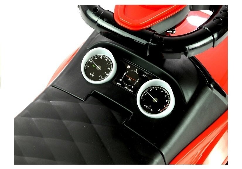 Большим преимуществом этого автомобиля для детей является мультимедийный руль и расположенные чуть ниже указатели скорости. Интерактивное рулевое колесо оснащено кнопками, активирующими приятные для слуха звуки и красочную подсветку. Пять видов разных звуков будут издавать что малыш почувствует себя настоящим водителем в своей машине.