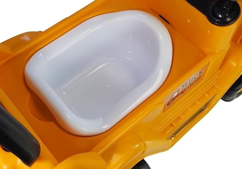Автомобиль выполнен из пластикового корпуса желтого цвета с черными дополнениями колес, вращающимся рулем, спинкой и подвижным кронштейном с ложкой на конце. Сиденье игрушечной машинки поднимается — пространство под ним можно использовать, в том числе, для хранения любимой игрушки малыша или сменной одежды.