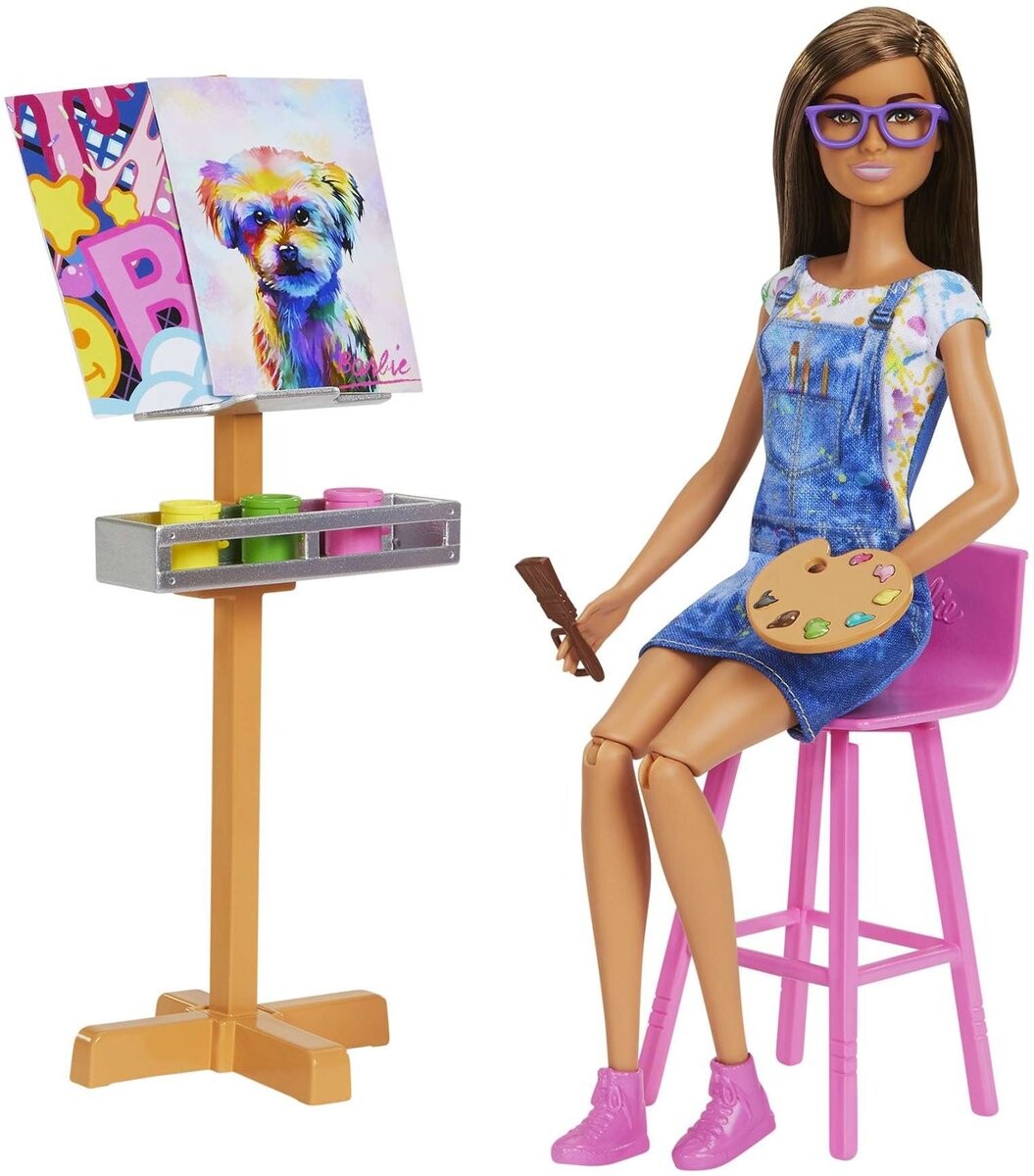 Кукла Барби может сидеть за мольбертом и с помощью палитры и кисти «рисовать» красивые картины на холсте (в комплект входят два холста).