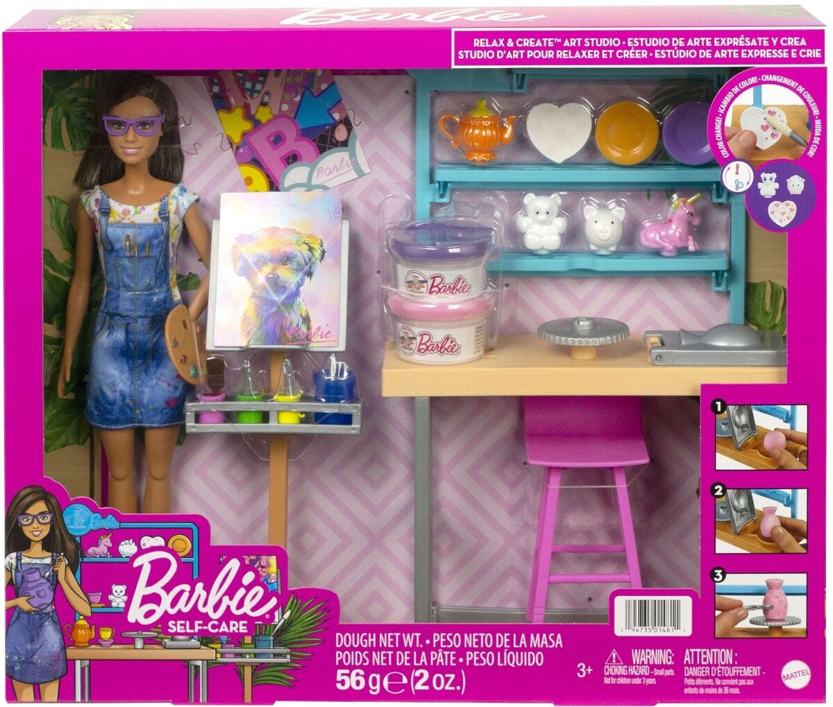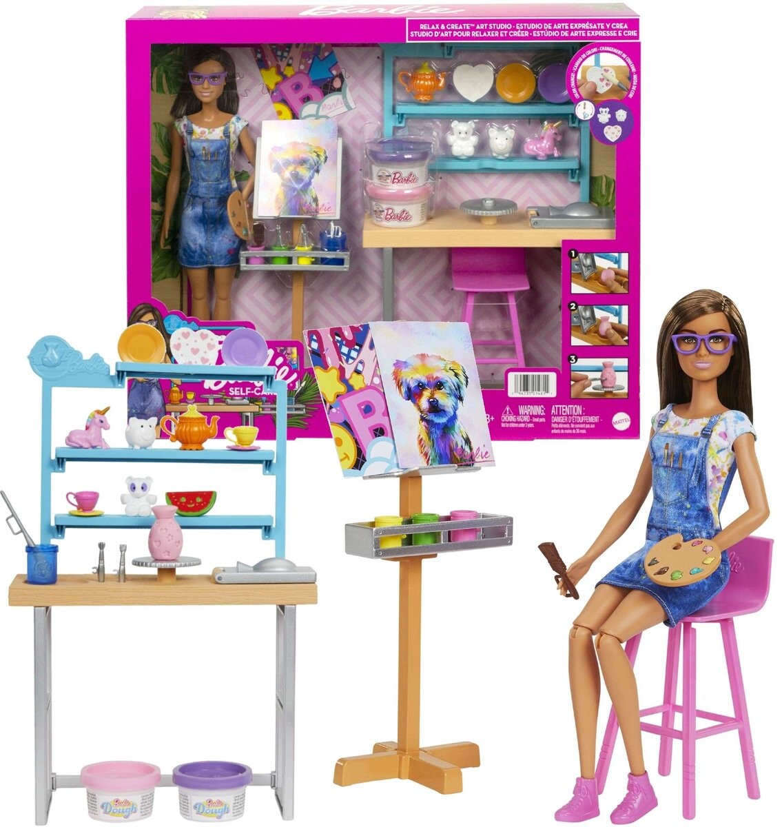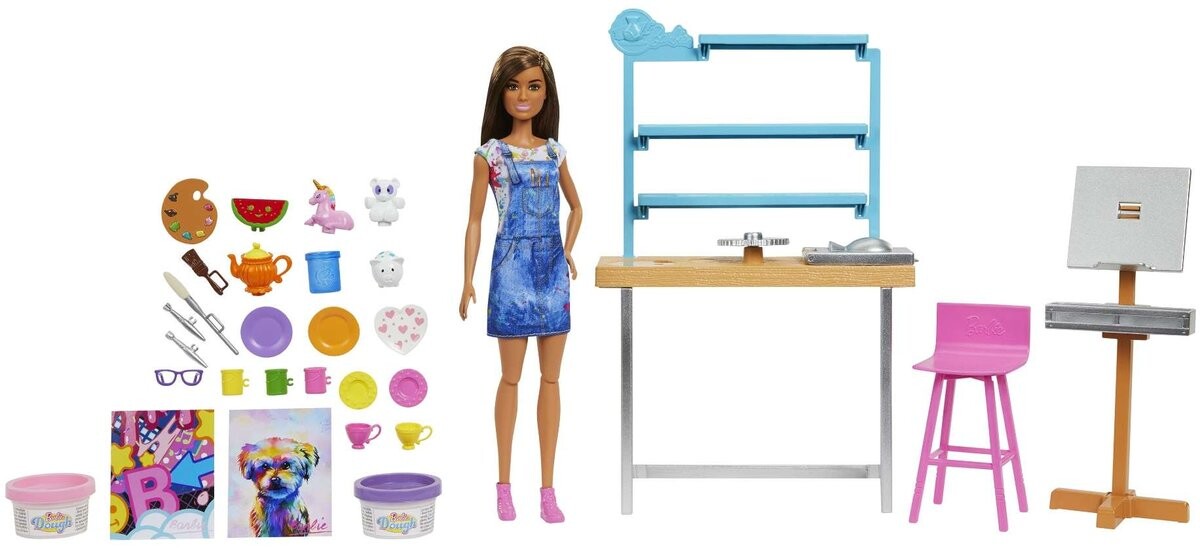 Расслабление через искусство Раскройте свой творческий потенциал при создании изделий из «керамики» и «рисовании» картин. В набор Barbie Art Studio входит кукла Барби с точками сгибания и более 25 аксессуаров, в том числе рабочее место, мольберт, ведра, тесто для лепки, а также инструменты для декорирования и рисования.