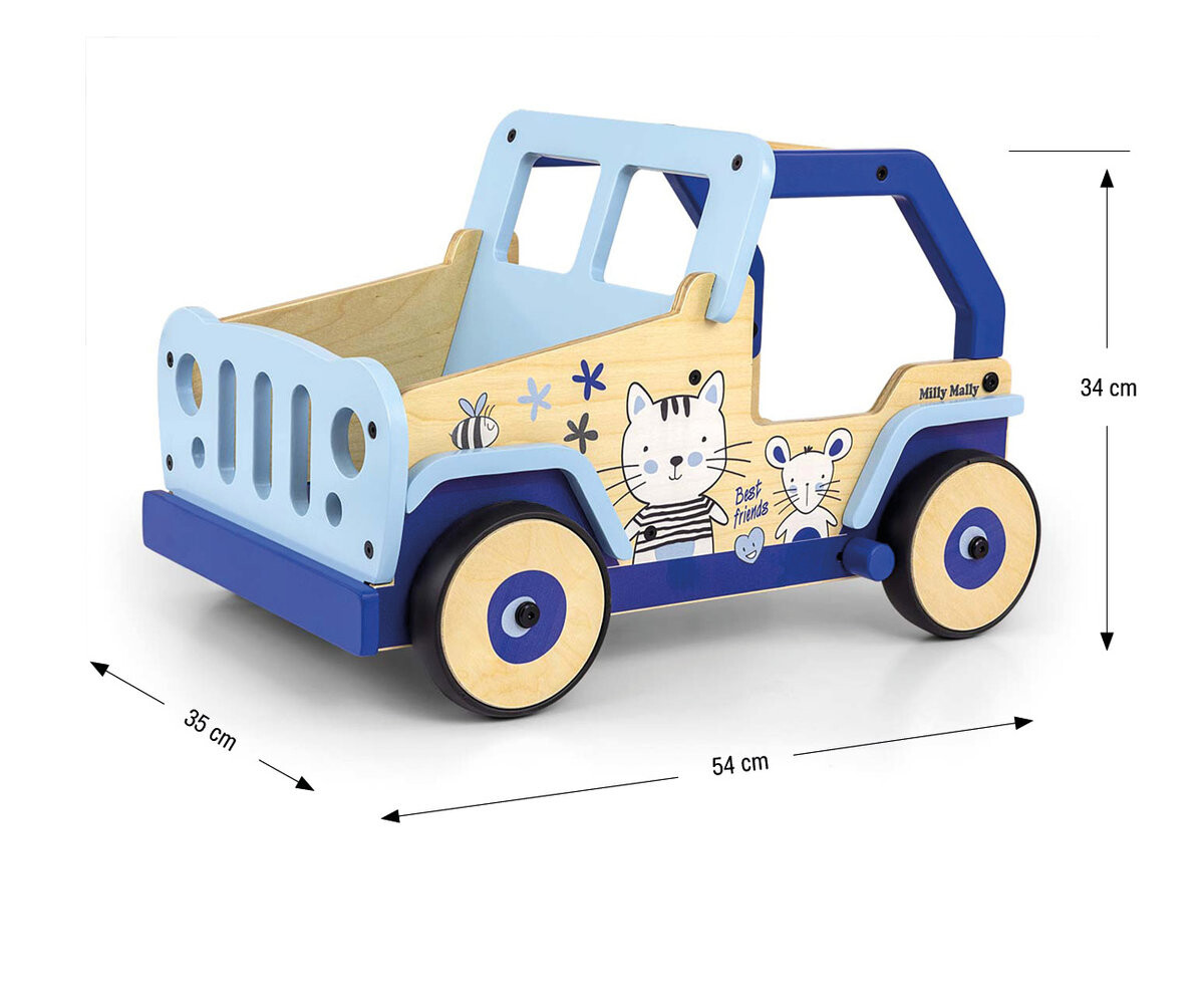 Игрушка-коляска для детей ExplorerДетские ходунки-толкатели, вдохновленные легендарными внедорожниками. Он изготовлен из высококачественной древесины и экологически чистых материалов. Колпаки колес изготовлены из мягкого материала TPR, который является гибким и прочным и позволяет использовать его на любых поверхностях, не причиняя повреждений и царапин. Основная задача ходунков Explorer – помочь малышу научиться ходить. Благодаря встроенной в конструкцию автомобиля ручке и боковым спинкам вероятность падения ребенка при первых шагах будет меньше. Игрушка оснащена тормозом, который родитель может активировать, если возникнет необходимость обездвижить транспортное средство. Дополнительное преимущество ходунков это вместительный багажник. Ваш ребенок сможет перевозить в нем свои любимые игрушки! Не содержит пластификаторов и экологически безопасен. Транспортное средство изготовлено из материалов высочайшего качества, которые отличаются высокой прочностью и безопасностью.  В ходе игры ребенок будет развивать навыки ходьбы, а также ручные и моторные навыки.  ХАРАКТЕРИСТИКИ: