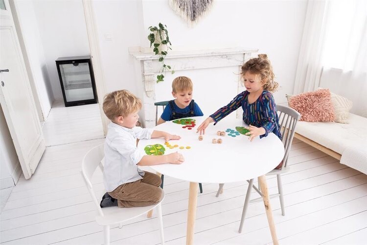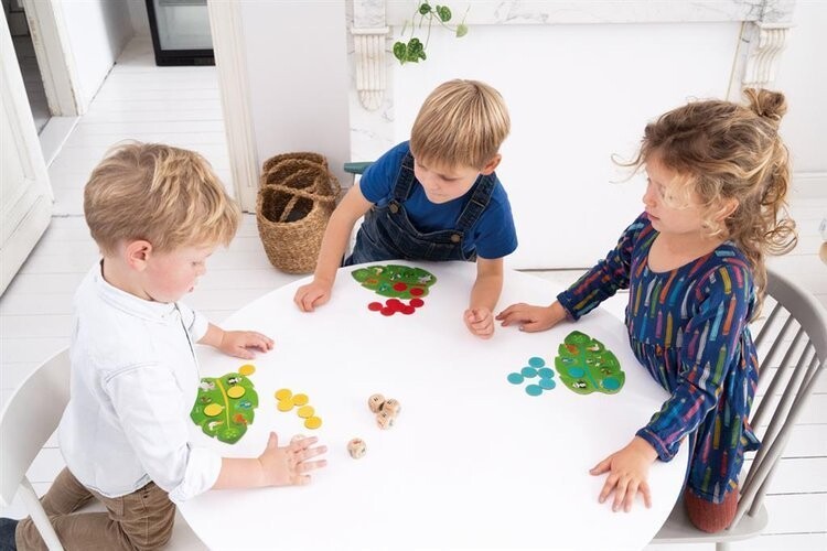 В комплект входит набор из 4-х деревянных игровых фишек 4-х цветов и игральный кубик.