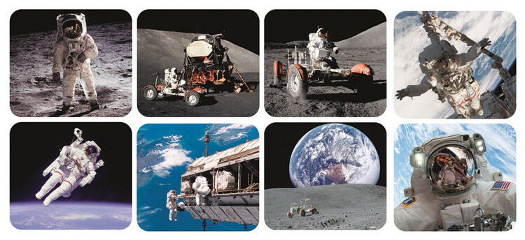 3 циферблата: Коллекция из 8 изображений различных работ и транспортных средств космонавтов, таких как работа на исследовательской станции в космосе, посещение чужой планеты с марсоходом и т. д.