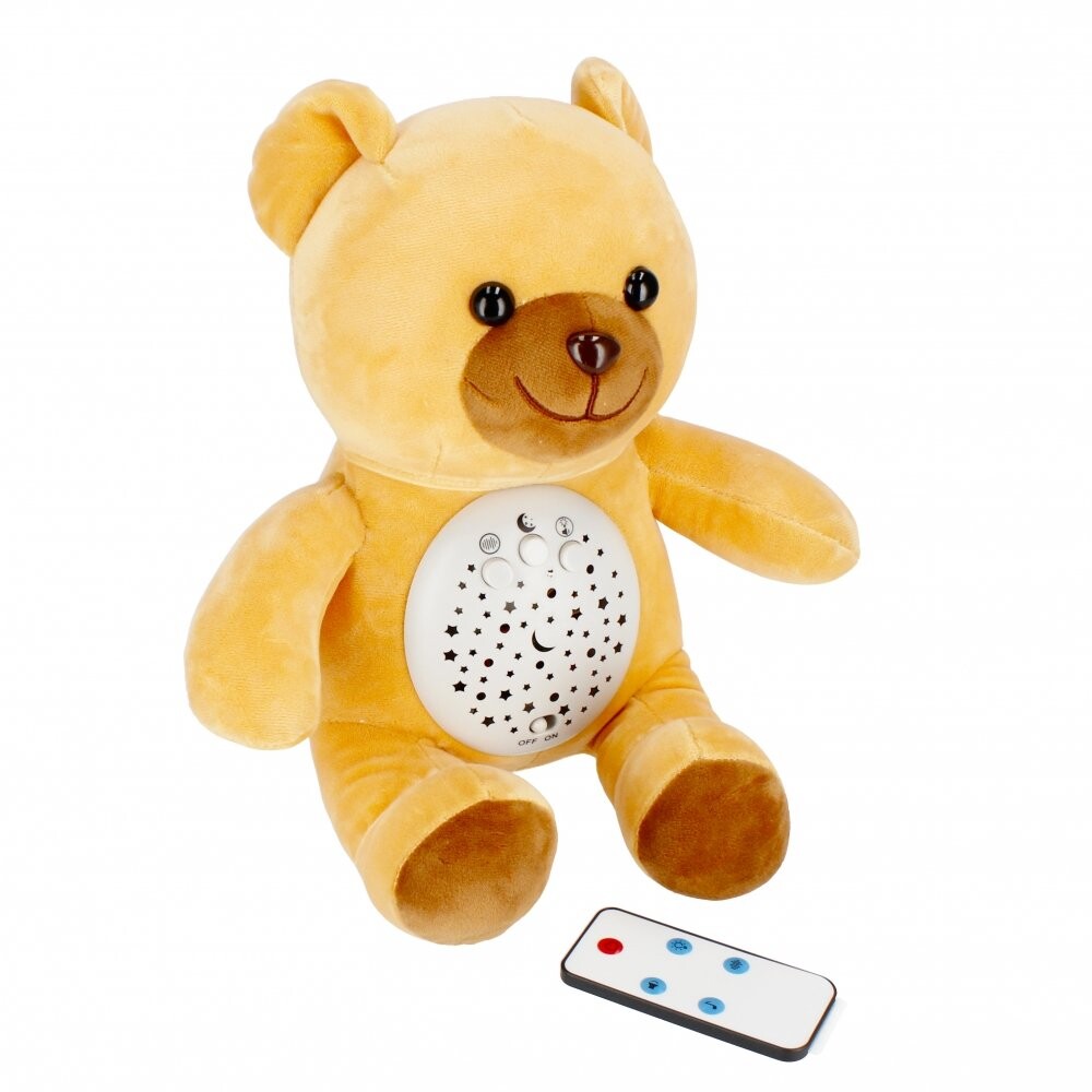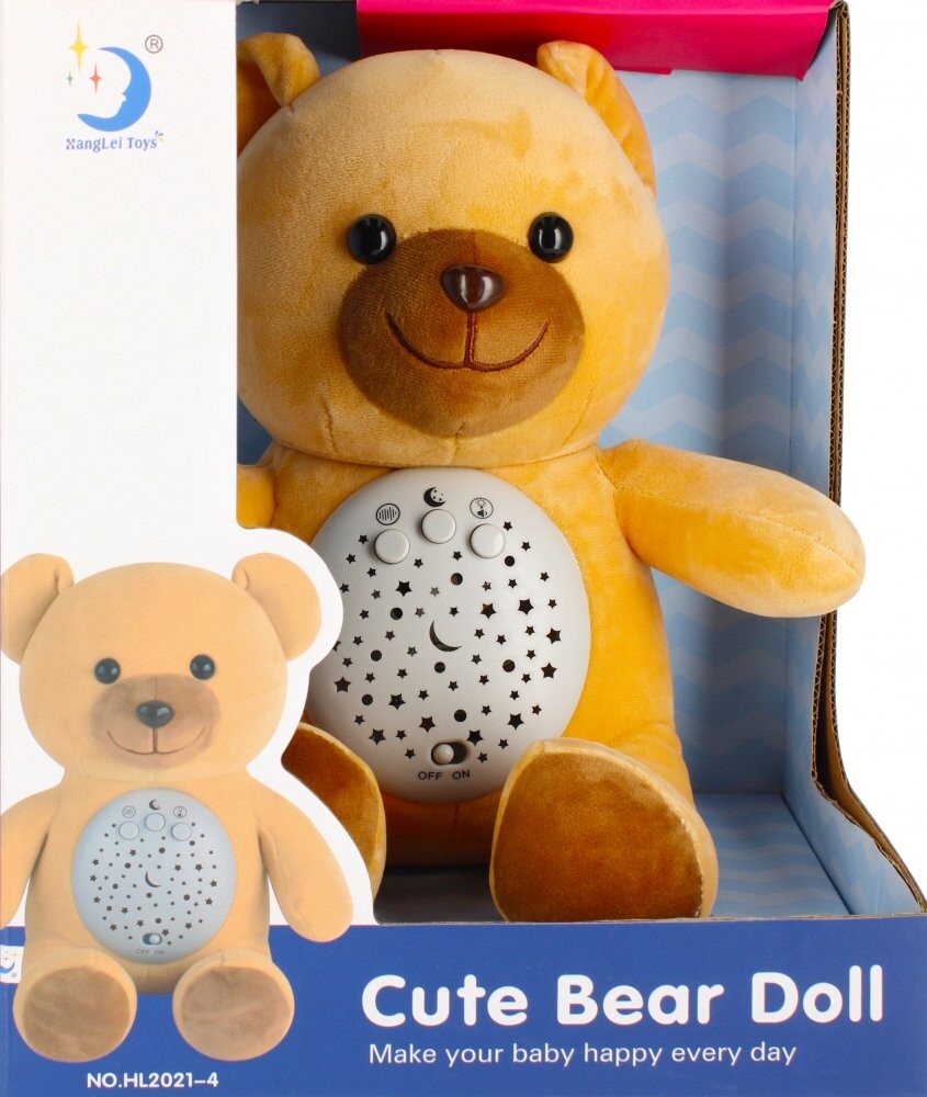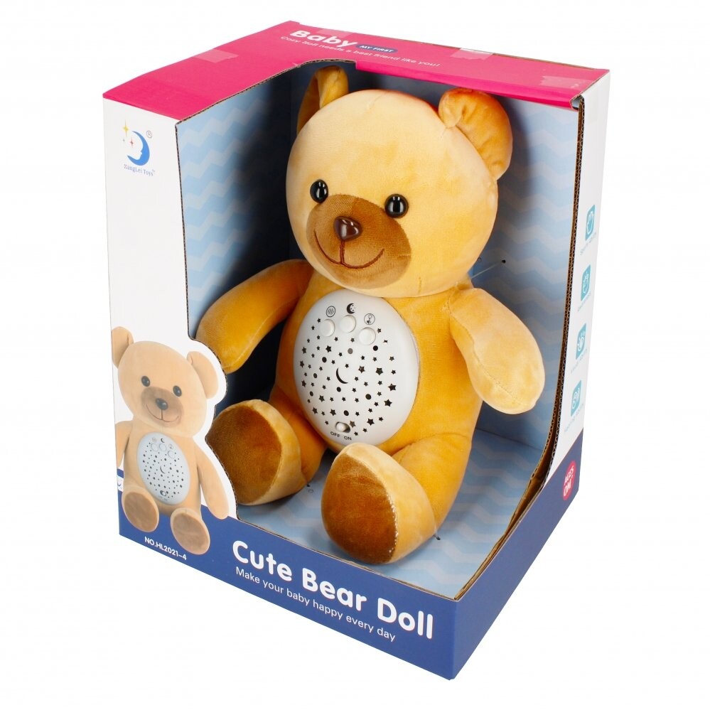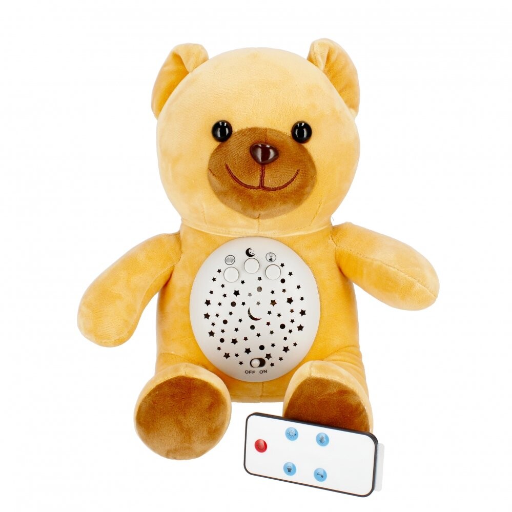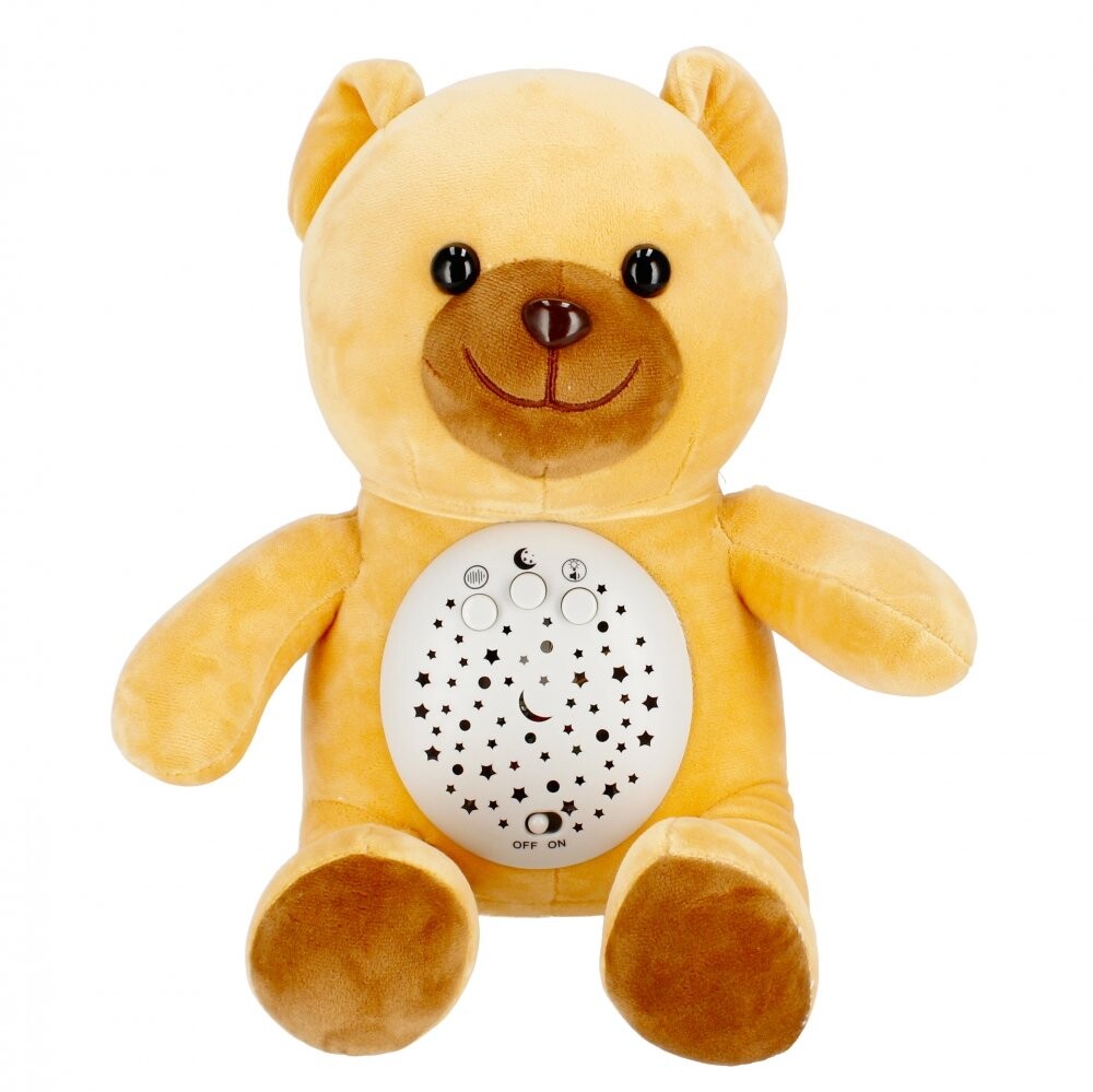 Преимущества изделия: стимулирует воображение ребенка, успокаивает и умиротворяет малыша, усыпляет, имеет звуковое и световое воздействие. МЕГА ТВОРЧЕСКИЙ Проектор с плюшевым мишкой поможет вашему ребенку заснуть, а вам будет легче менять подгузник ночью или кормить его ночью. Медвежонок может подсветить потолок над кроваткой ребенка созвездиями разных цветов, что будет полезно, например, при рассказе сказки на ночь. В комплекте: проектор с мишкой Тедди. Игрушка из плюша и пластика. Размеры/вес/батарейки: размеры изделия: высота х ширина см: 27х25, размеры упаковки: длина х высота х глубина. см: 24x29x21, вес изделия без упаковки кг: 0,32 кг, вес изделия в упаковке кг: 0,62 кг, требуется 2 батарейки AALR06 - в комплект не входят. Игрушка предназначена для детей в возрасте: 0м. Проектор упакован в коробку с окошком. В картонной коробке 6/12 шт.