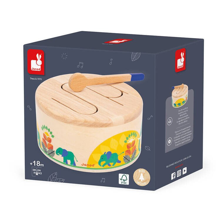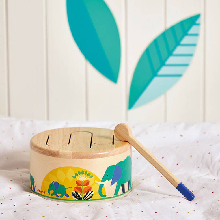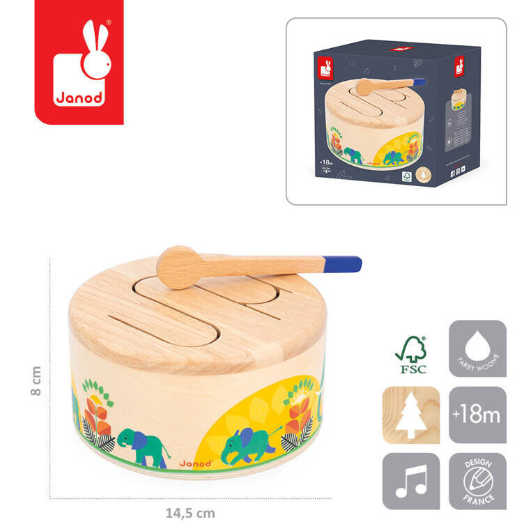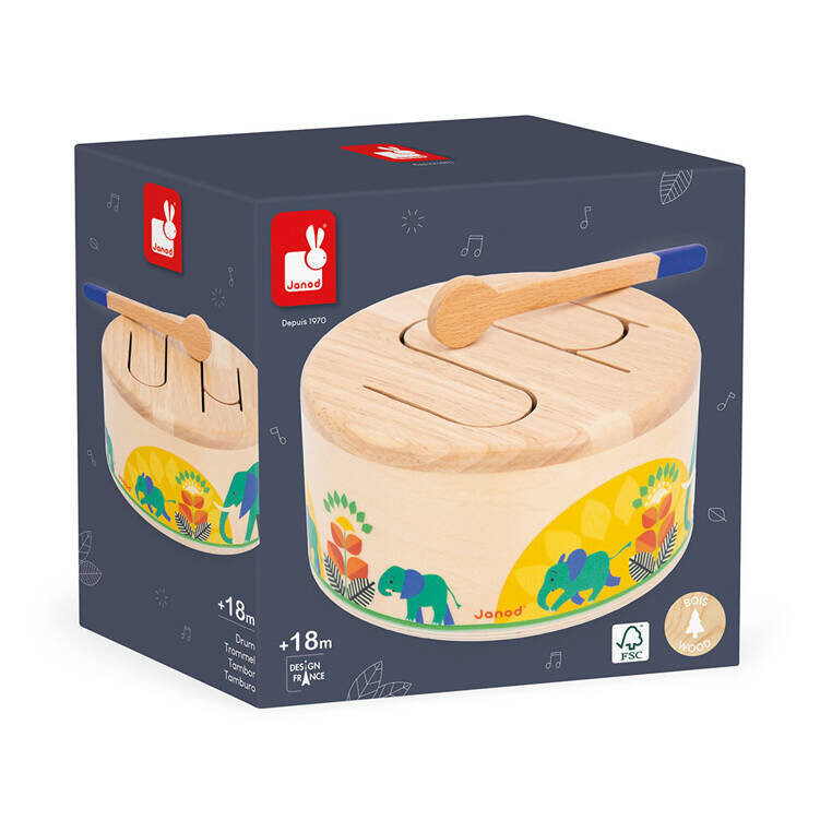 Деревянный барабан из серии Gioia от французского бренда JANOD – идеальная первая музыкальная игрушка для ребенка, которая помогает развивать слух, чувство ритма и музыкальные способности. Он также поддерживает развитие воображения, концентрации, настойчивости и координации движений.