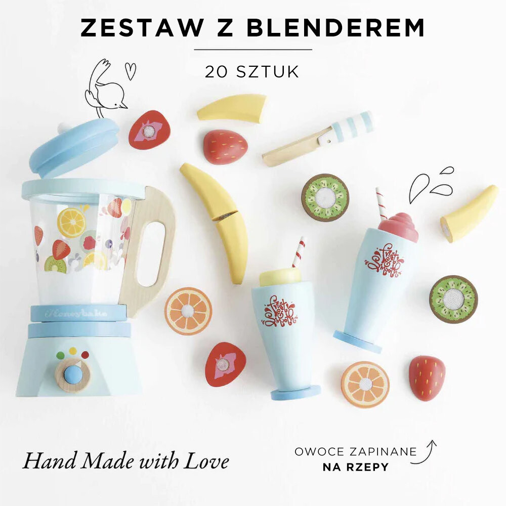 Содержит классический блендер с отдельным кувшином, 6 нарезанных фруктов, игровой нож и 2 деревянные чашки со съемными аксессуарами.