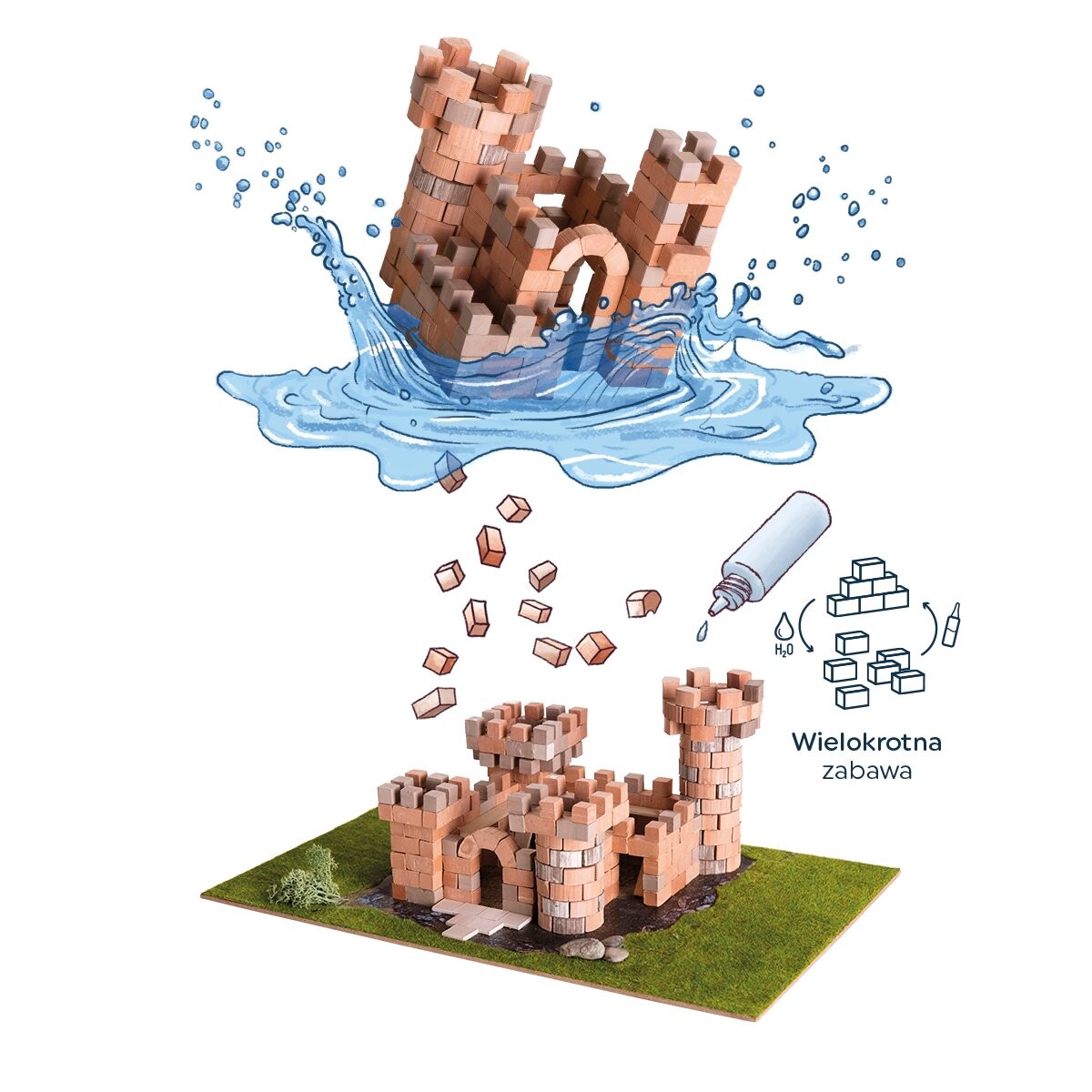 Cиз наборов Brick Trick можно использовать многократно! Просто погрузите конструкцию в воду и подождите несколько минут. Кирпичи отсоединятся друг от друга самопроизвольно, или вы можете аккуратно разделить их. Затем очистите их от остатков клея и подождите, пока они высохнут. Готовый ! Пришло время использовать их для создания еще одного здания!Содержимое коробки:
