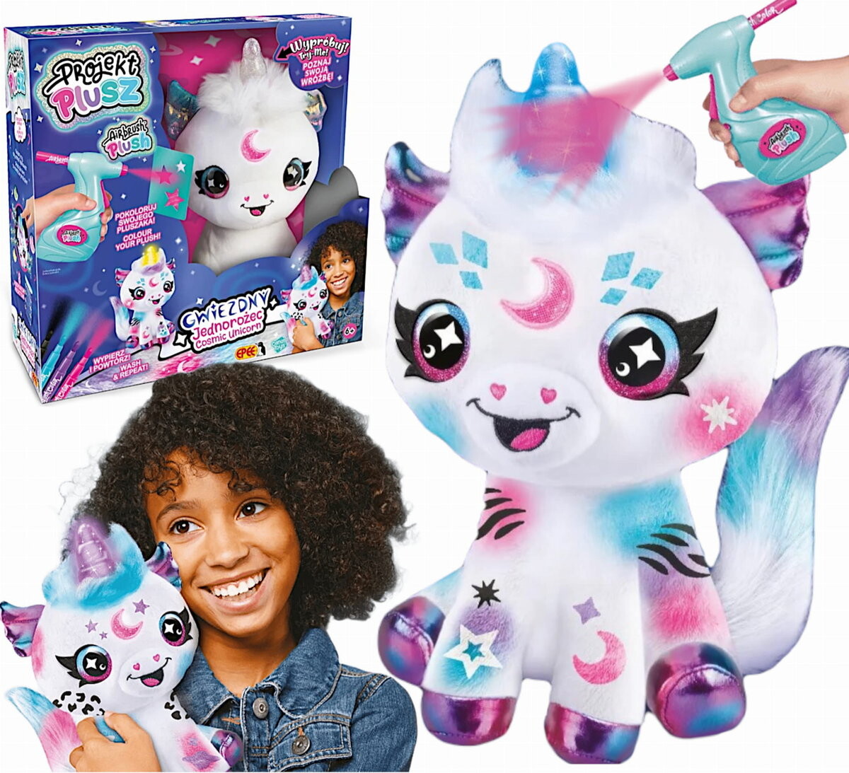 Project Plush - Звездный Единорог со светящимся рогом - необыкновенная игрушка, которая впечатляет не только своей мягкостью, но и интерактивностью. Единорог отвечает на вопросы, светясь разными цветами. а прилагаемое руководство позволяет вам прочитать его ответы. Дети смогут разукрасить его с помощью аэрографа, фломастеров и трафаретов, создавая свои неповторимые стили. После игры вы можете вымыть мягкую игрушку и снова приступить к ее украшению, что обеспечит бесконечное удовольствие. Это идеальная идея для креативного подарка.
