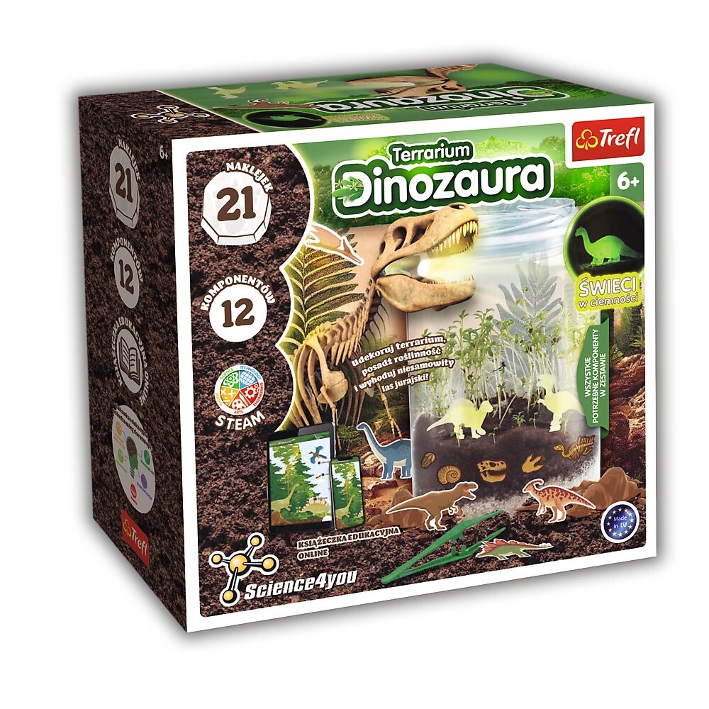 Украсьте свой террариум, посадите растительность и вырастите удивительный юрский лес с помощью террариумного набора «Динозавр» Science4you! Следите за тем, как прорастают семена, и поливайте почву, когда она высыхает. Украсьте террариум наклейками, чтобы создать удивительную экосистему. Вставьте фигурки динозавров и выключите свет, чтобы увидеть, как они светятся в темноте! Узнайте, какой была среда обитания динозавров. Знаете ли вы, какие растения и животные существовали в юрском периоде? Узнайте больше с набором террариума «Динозавр»! В комплект входят все необходимые компоненты.