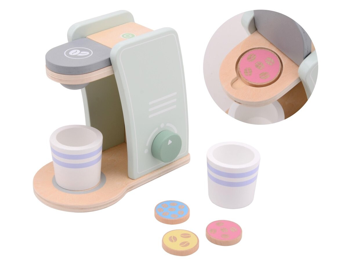 Кофемашина с деревянными капсулами идеально подходит для детей от 24 месяцев и в игровой форме знакомит их с удивительным миром кухонной техники. На кухне становится все больше различных приспособлений и поэтому мир детской фантазии и их игр должен быть актуальным. Красивая пастельная и современная кофемашина поможет вашему воображению. В набор входят 3 разные кофейные капсулы, которые можно попеременно помещать в кофемашину и затем подавать вкусный кофе в деревянной чашке. Долгое удовольствие гарантировано и красивый элемент деревянной кухни бренда - в предложение также входят миксер, блендер и тостер!