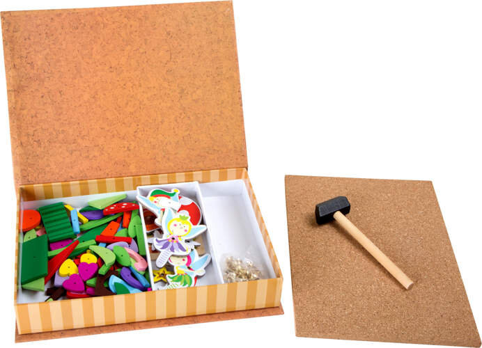 • в набор входит 80 пазлов - элементы для забивания гвоздей, деревянный молоток, 4 карточки с примерами того, какие истории можно создать, 1 пробковая доска и 80 булавка