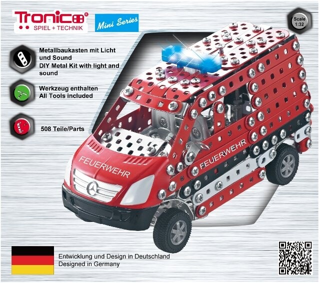 TRONICO 10042 - Пожарная машина - Mercedes Benz Sprinter - 1:32 Размеры - 17 х 7 х 9 см. Количество деталей - 508. Набор состоит из качественных металлических и пластиковых элементов. Из набора можно собрать модель машины скорой помощи или. машина скорой помощи. Модель имеет подвижные колеса. Детали имеют ажурную конструкцию, некоторые из них необходимо скреплять шурупами. В наборе есть все необходимые инструменты, а также имеется инструкция для легкой сборки. Рекомендуется для людей старше 8 лет. Набор упакован в эстетичную, идеальную подарочную коробку.