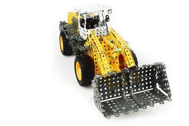 Из набора можно собрать модель бульдозера-погрузчика. Модель имеет подвижные колеса. В наборе все есть.
